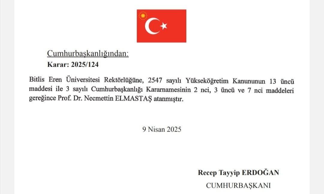 Cumhurbaşkanımız Sayın Recep Tayyip Erdoğan, 2547 sayılı Yükseköğretim Kanunu’nun 13. maddesi ile 3 sayılı Cumhurbaşkanlığı Kararnamesi’nin 2, 3 ve 7. maddeleri gereğince Bitlis Eren Üniversitesi Rektörlüğüne Prof. Dr. Necmettin Elmastaş'ı yeniden atadı.