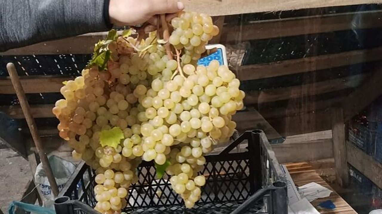 Bitlis'in Ahlat ilçesinde sebzecilik yapan Emir Kurtoğlu'nun tezgahında sergilediği, her biri 560 gramlık üzüm salkımlarının büyük ilgi gösterdiği dikkat çekiyor.