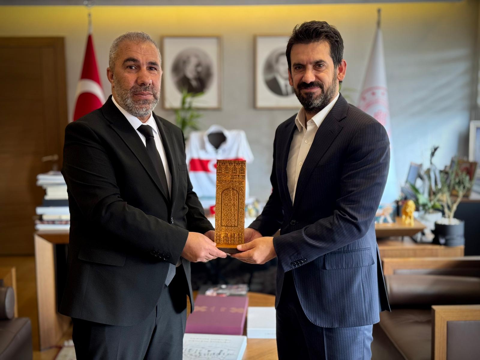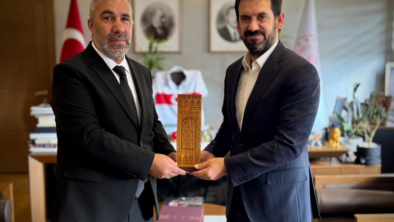 Samimi bir ortamda gerçekleşen ziyaretin sonunda Başkan Adıyaman, Bakan Yardımcısı Mumcu’ya Ahlat Selçuklu Mezar Taşı maketi hediye etti.