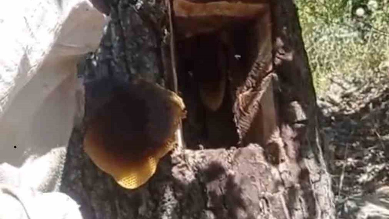 Elazığ’ın Palu ilçesinde arıların izini süren 2 kişi ağaç kovuğundan petek petek halinde yaklaşık 5 kilo bal çıkardı.