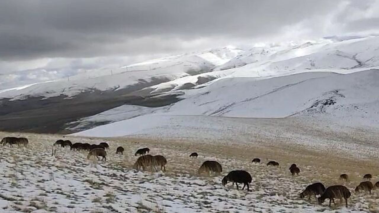 Ağrı'nın yüksek kesimlerinde etkili olan kar yağışına hazırlıksız yakalanan çoban, koyunlarını kar altında otlattı.