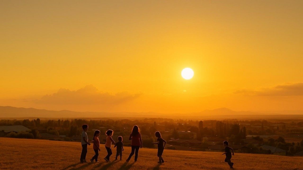 Günün son ışıklarıyla birlikte gökyüzü sarıdan kızıla dönerken, doğanın içinde oyun oynayan çocuklar, otlayan hayvanlar ve rengarenk açmış kır çiçekleri ile manzara adeta bir kartpostalı andırıyor.