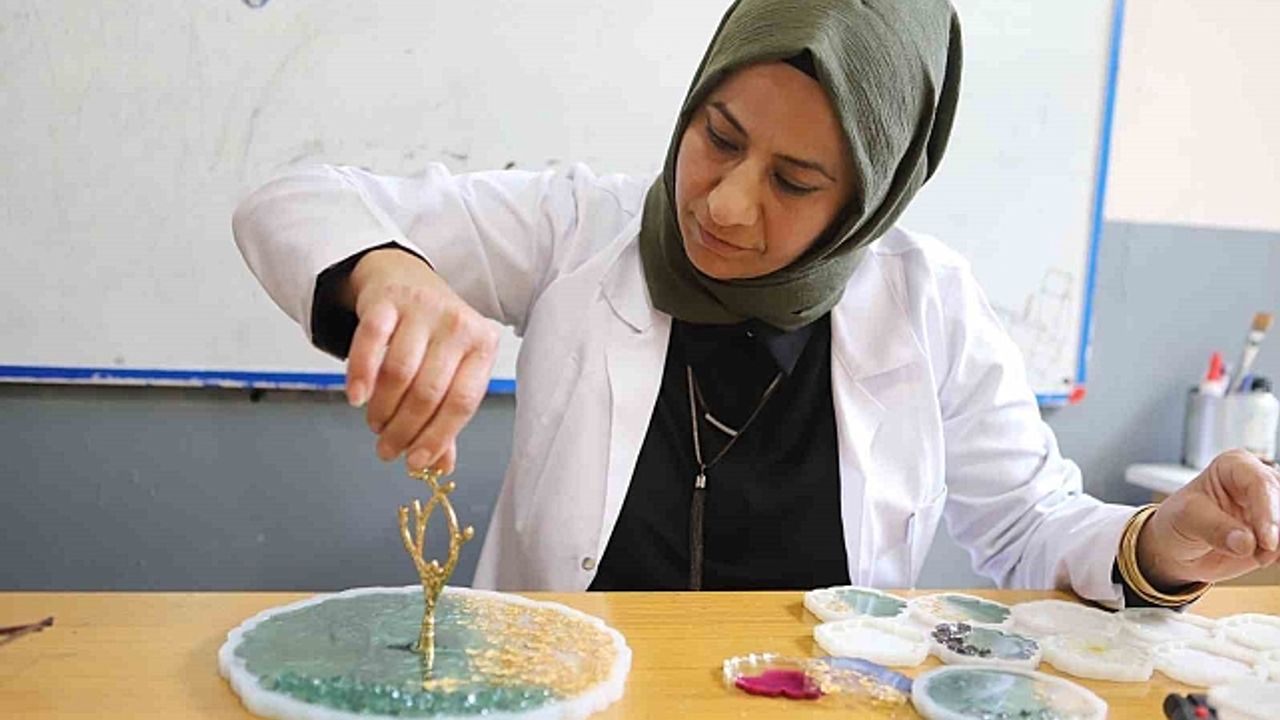 Ağrı Halk Eğitimi Merkezi tarafından açılan epoksi kursunda kadınlar, yaptıkları çeşitli tasarımlarla hem sanat öğreniyor, hem de aile bütçelerine katkıda bulunuyorlar.