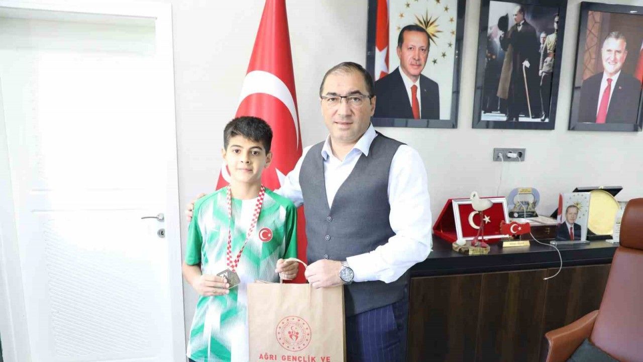 Hırvatistan’da düzenlenen 12. Li-Ning Zagreb Youth Open turnuvasında U-13 kategorisinde altın madalya kazanarak şampiyon olan Ağrılı milli sporcu Eyüp Murat Alpaslan, elde ettiği başarının ardından Gençlik ve Spor İl Müdürü Ahmet Çelebi’yi ziyaret etti.