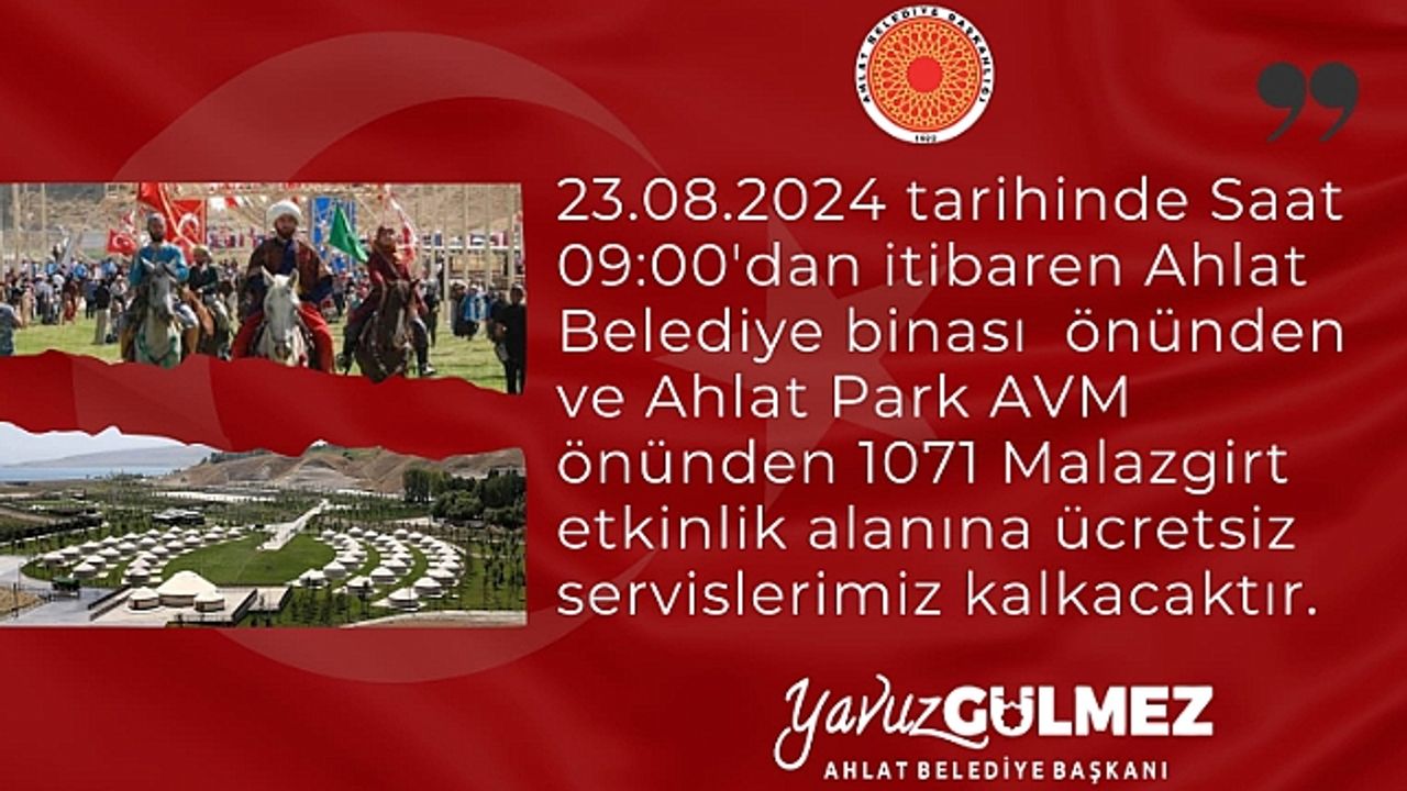 Ahlat Belediyesi sosyal medya hesabından yaptığı paylaşımda, 23.08.2024 tarihinde saat 09.00’dan itibaren Ahlat Belediyesi ve Ahlatpark AVM önünden 1071 Malazgirt Zaferi kutlama alanına ücretsiz servis araçlarının bulunduğunu duyurdu.