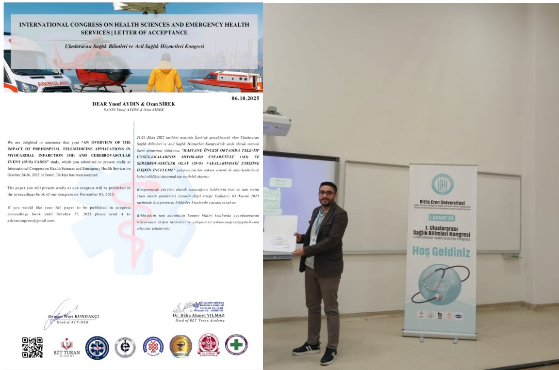 Ahlat Devlet Hastanesi hemşirelerinden Yusuf Aydın, uzun süredir üzerinde çalıştığı “Hastane Öncesi Ortamda Tele-tıp Uygulamalarında Miyokart Enfarktüsü (Mİ) ve Serebrovasküler Olay (SVO) Vakalarındaki Etkisine İlişkin İnceleme” adlı araştırmasıyla büyük bir başarı elde etti.