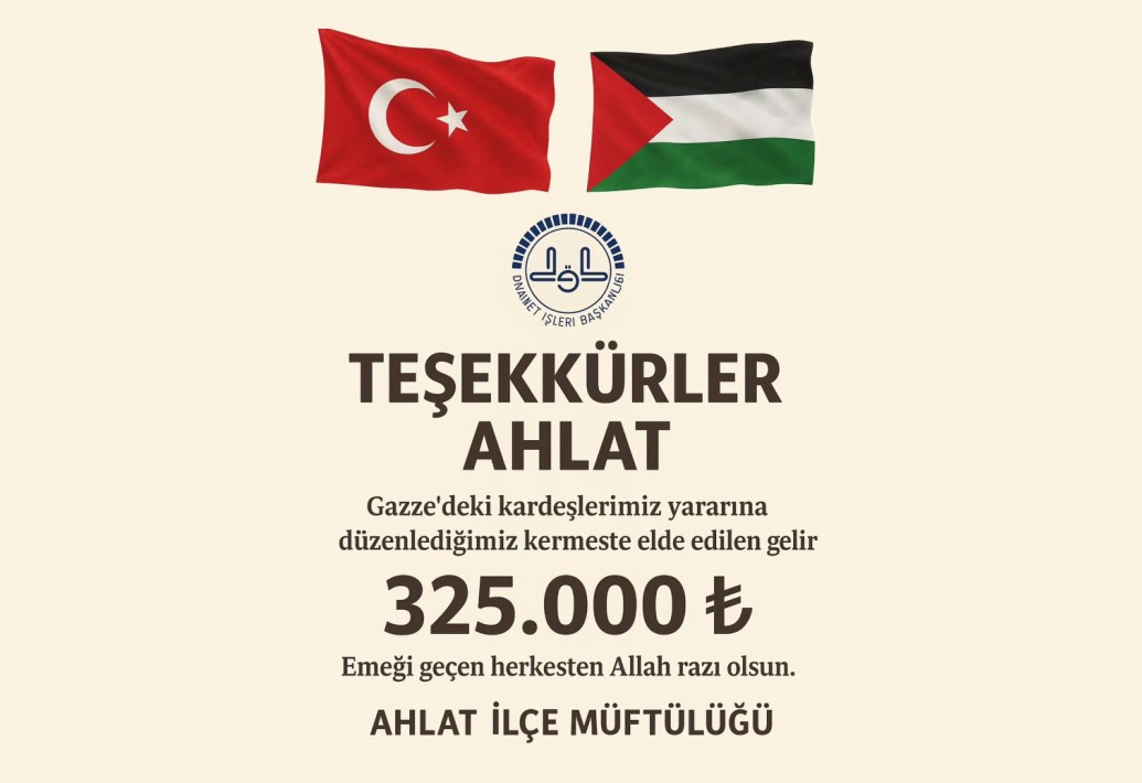 Ahlat Müftülüğü’nden yapılan açıklamada, kermesten elde edilen gelirin tamamının Gazze’ye gönderileceği belirtilerek şu ifadelere yer verildi: “Gazze yararına düzenlediğimiz kermesimize gönülden destek veren tüm halkımıza teşekkür ediyoruz. Kermesimizden elde edilen 325.000 TL gelir, Gazze’ye ulaştırılacaktır. Destek veren, emeği geçen herkesten Allah razı olsun.”