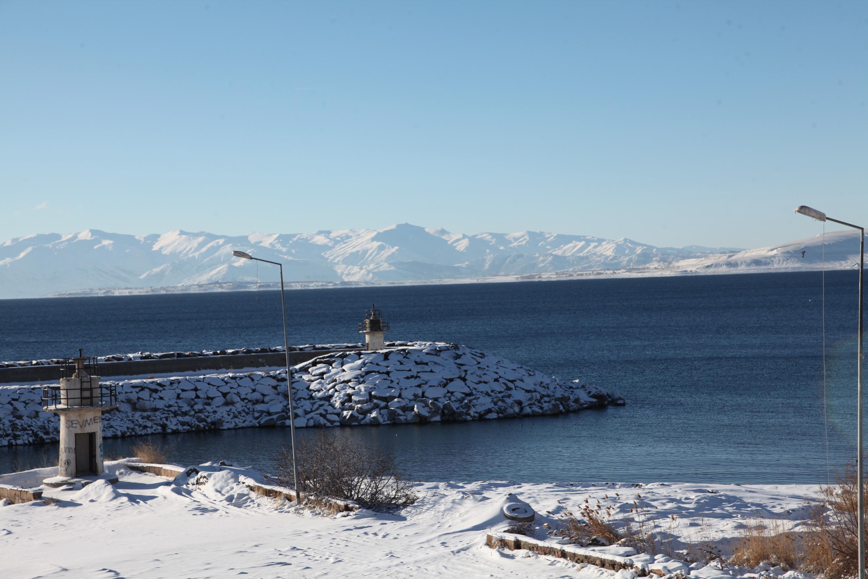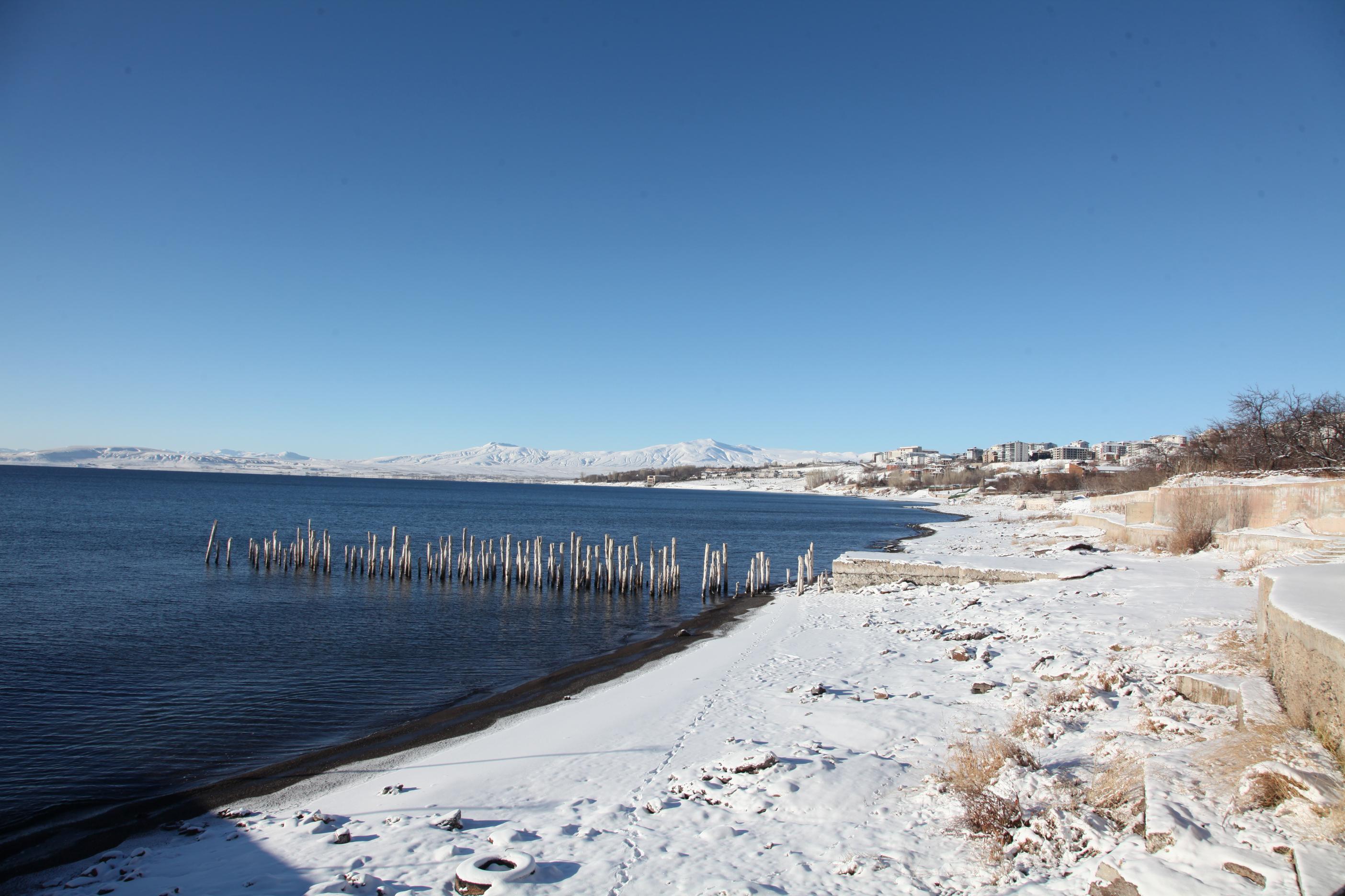 Van Gölü’nün maviliğiyle karın beyazlığının buluştuğu sahil şeridi, ortaya seyrine doyumsuz manzaralar çıkardı.