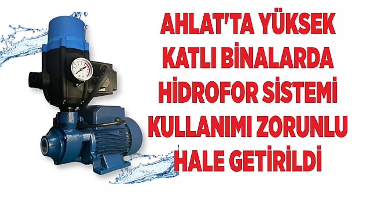 Ahlat Belediyesi’nin aldığı meclis kararıyla ilçedeki 3 kat ve üzeri binalarda hidrofor sistemi kullanımı zorunlu hale getirildi. Ahlat Belediyesi’nden yapılan açıklamada şehir şebeke hatlarının eski olması nedeniyle suyun yüksek katlara ulaştırılırken şehir şebekesinde hem arıza hemde su kaybı yaşandığı belirtildi. Açıklamada şu ifadelere yer verildi; “İlçemizdeki 3 kat ve üzeri yapılarda, şehir şebeke hatlarının eski olması nedeniyle suyun ulaştırılmasında meydana gelen arızalar ve patlaklar hem su kaybına hem de ek maliyetlere sebep olmaktadır. Bu durumun önüne geçmek ve suyun daha sağlıklı bir şekilde temin edilmesini sağlamak amacıyla, 3 kat ve üzeri binalarda hidrofor sistemi kullanımı encümen kararı ile zorunlu hale getirilmiştir.”