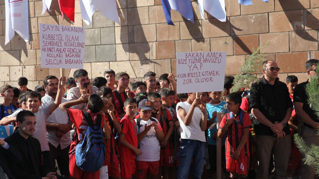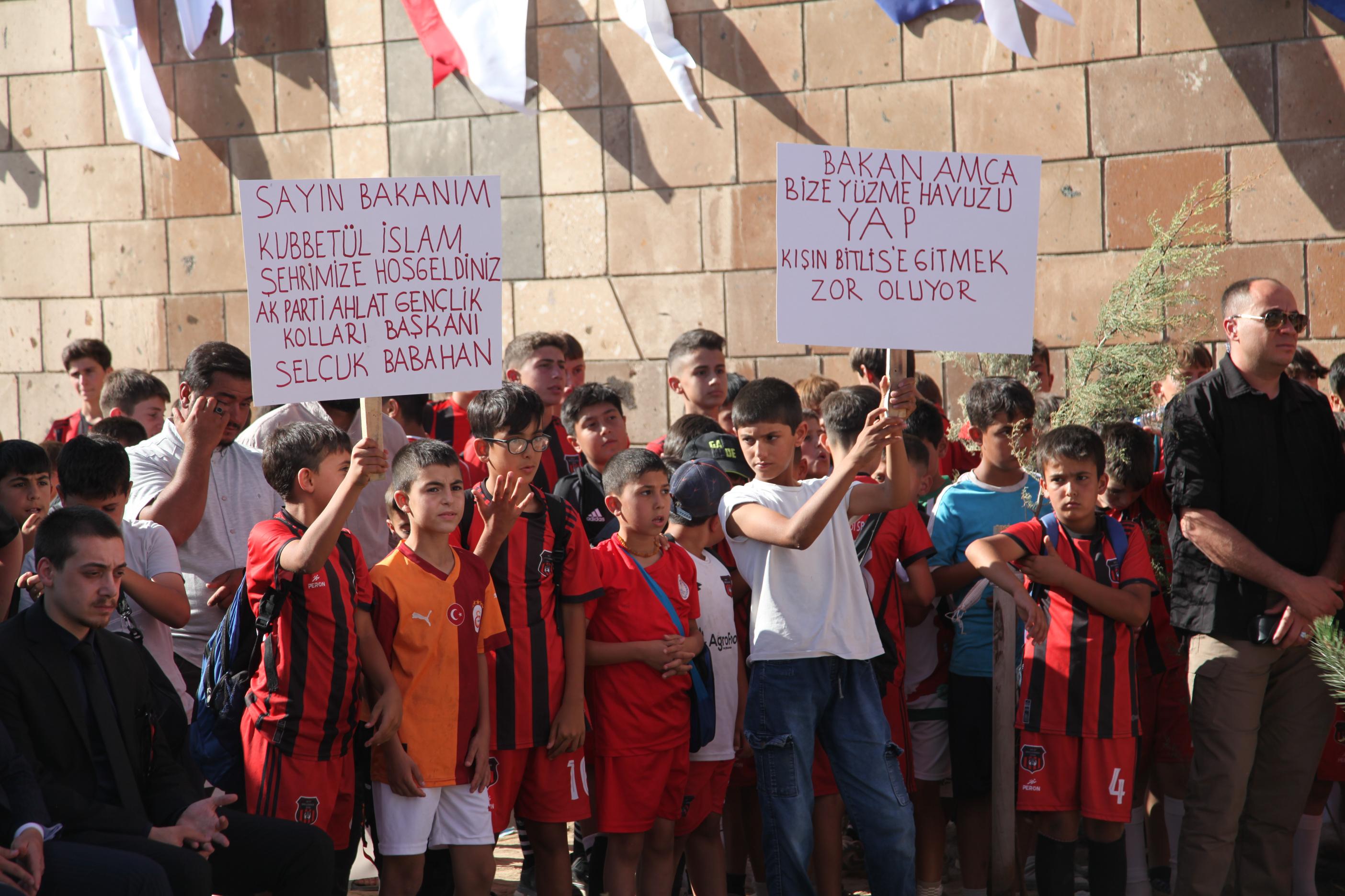 Açılış töreni sırasında Ahlatlı çocuklar, ellerindeki dövizlerle Bakan Bak’a kapalı yüzme havuzu yapılması talebinde bulundu.