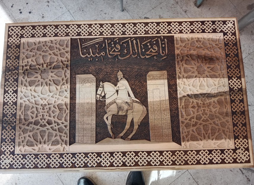 Yaklaşık bir aylık titiz bir çalışmanın ürünü olan tabloda; Fetih Suresi’nin ilk ayeti, Sultan Alparslan’ın silueti, Selçuklu mezar taşı ve geleneksel motiflere yer verildi.