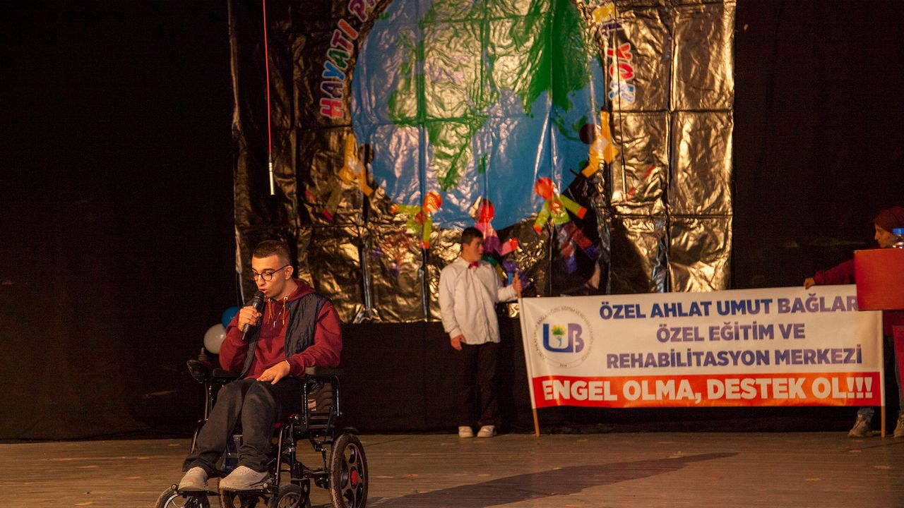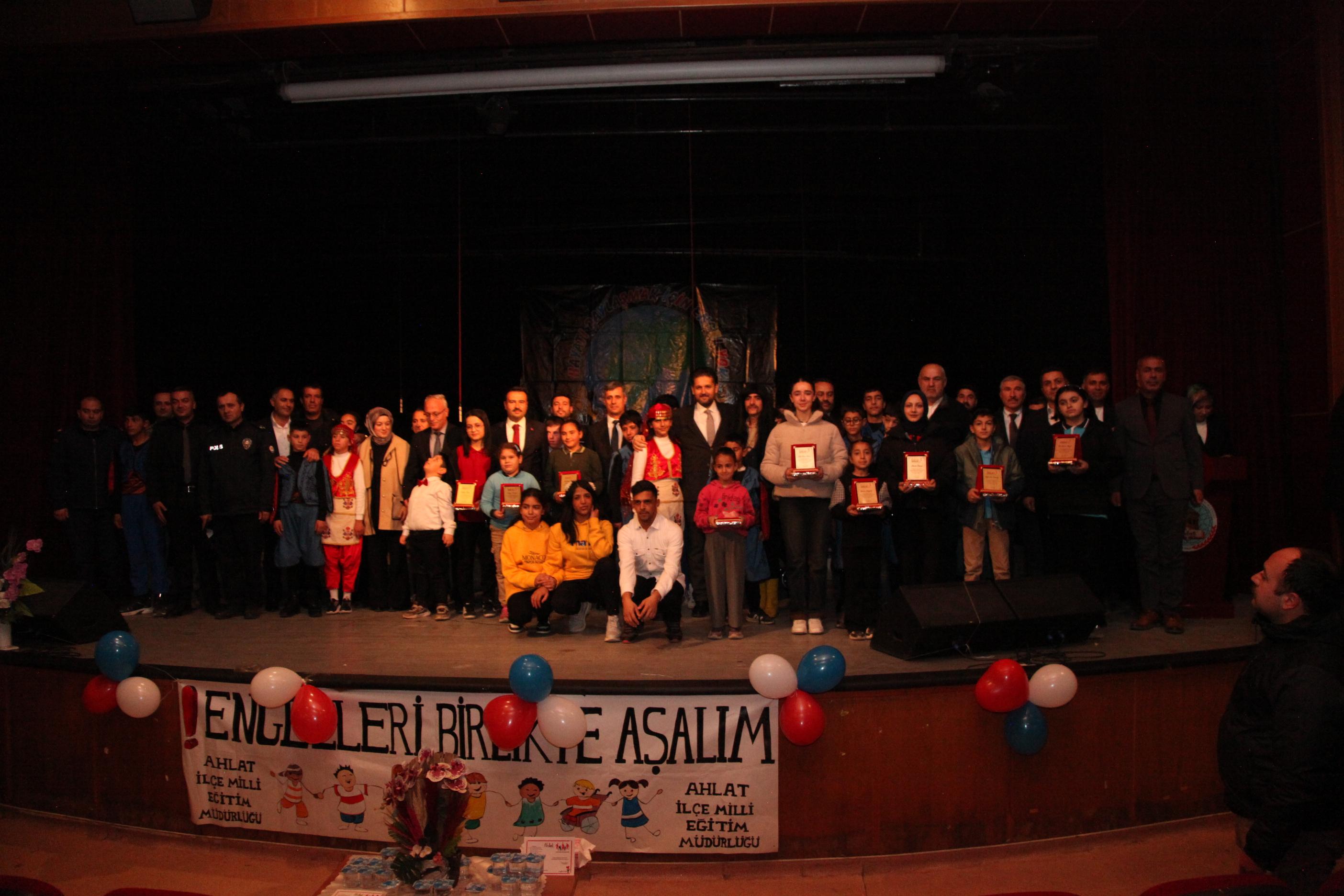 Ahlat Saadet Ayber Özel Eğitim Uygulama Okulu organizasyonunda, ilçedeki özel rehabilitasyon merkezlerinin katkılarıyla Ahlat Halk Eğitimi Merkezinde gerçekleştirilen program; Saygı Duruşu ve İstiklal Marşı’nın okunmasıyla başladı.