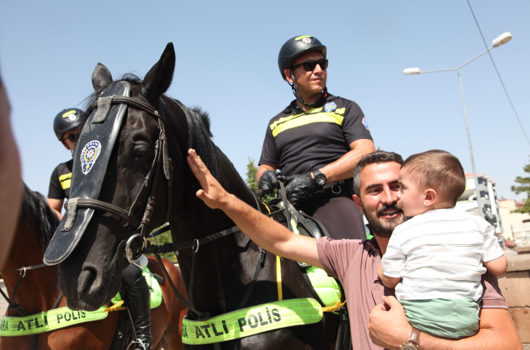 Vatandaşlar çocuklarını kucaklarına alarak polislerle hatıra fotoğrafı çektirirken, bazı çocuklar dakikalarca atları sevdi. Atlı polis ekibiyle hatıra fotoğrafı çektiren çocukların mutluluğu gözlerden kaçmadı.