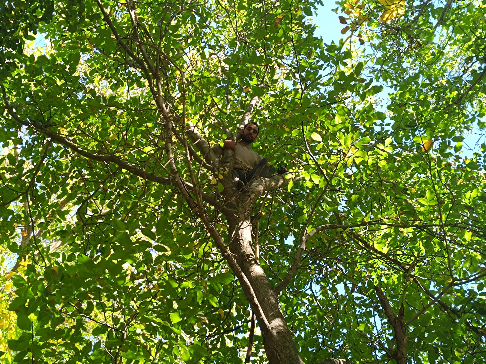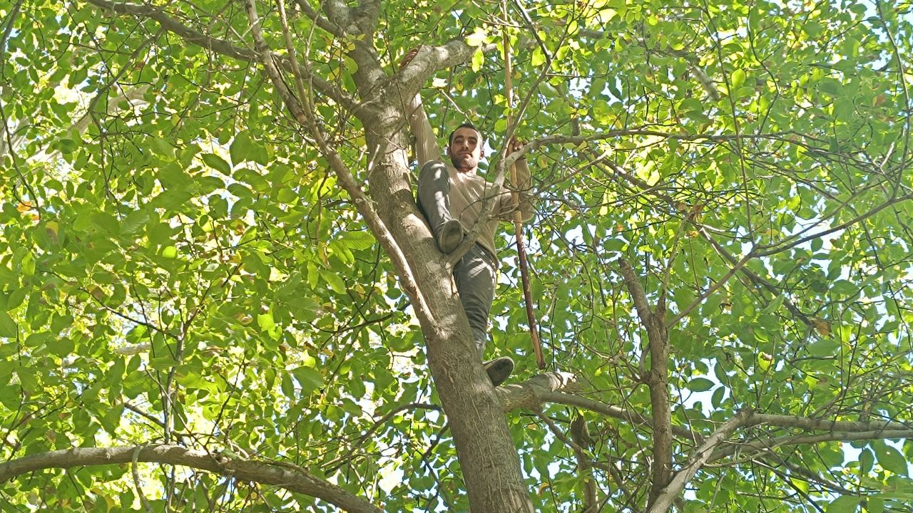Ceviz ağaçlarının en yüksek dallarına kadar çıkarak cevizleri döken Mehmet Kerem Algın, uzun süredir ilçede bu işle uğraştığını söyledi.