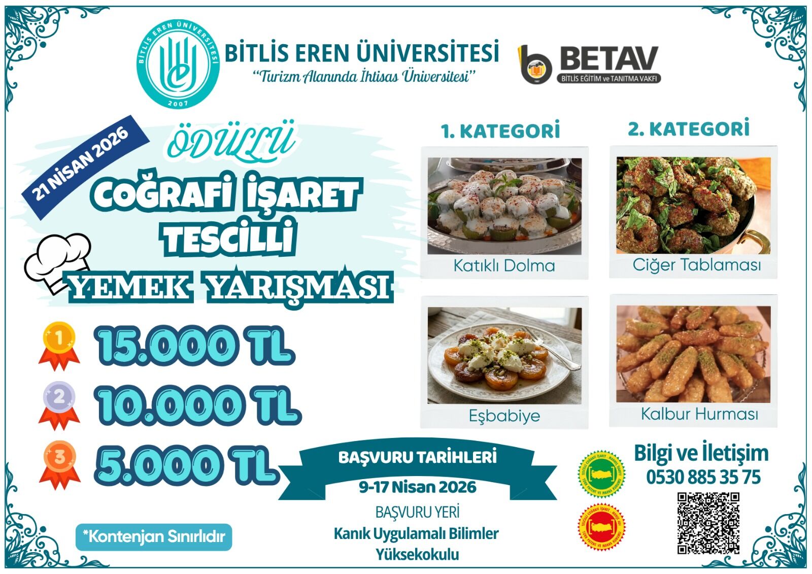 Kanık Uygulamalı Bilimler Yüksekokulu Müdürü Doç. Dr. Erkan Denk, yarışmanın amacına ilişkin yaptığı açıklamada, Bitlis’e ait coğrafi işaret tescilli yemeklerin tanıtımına katkı sunmayı hedeflediklerini belirtti.