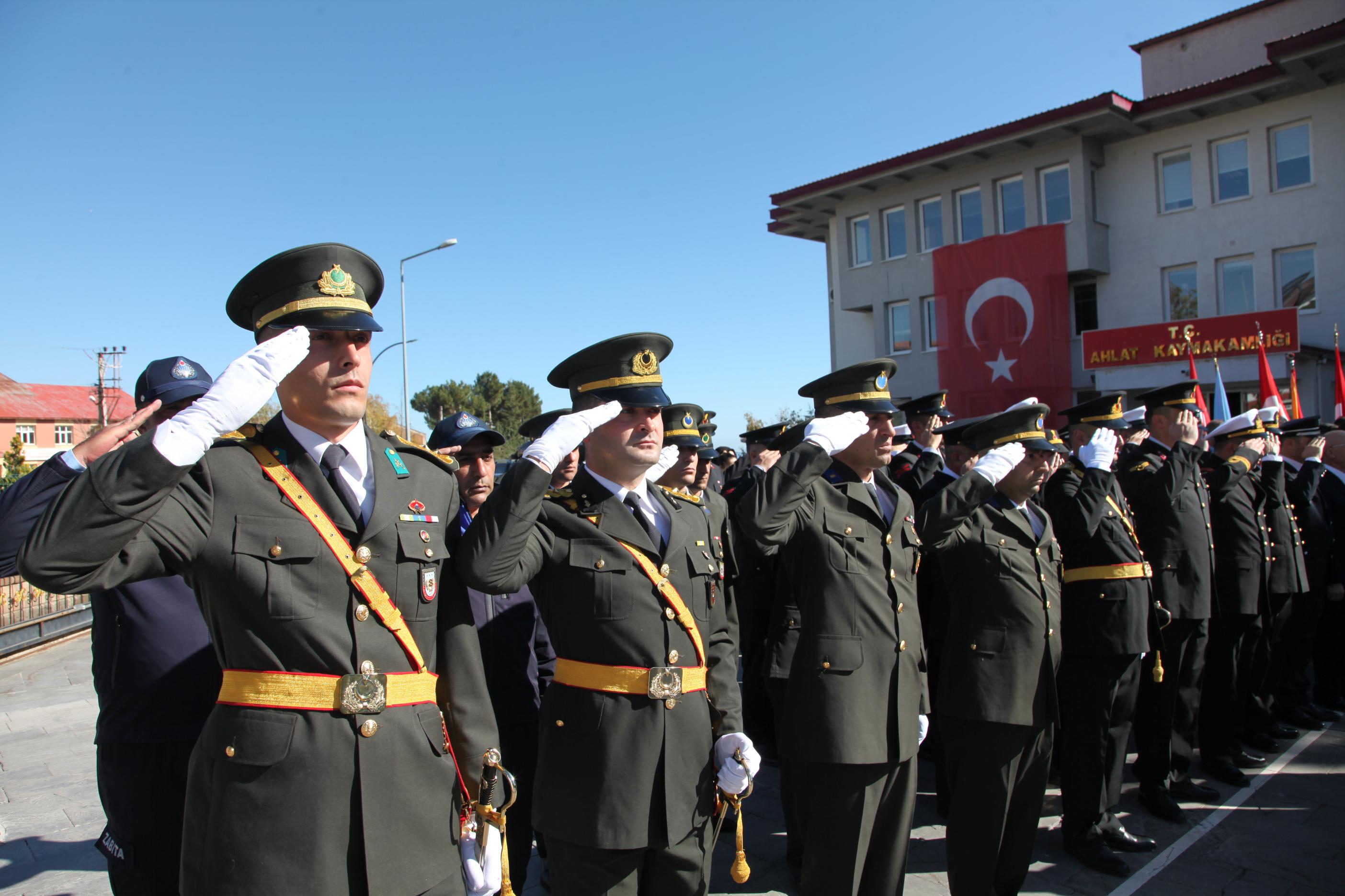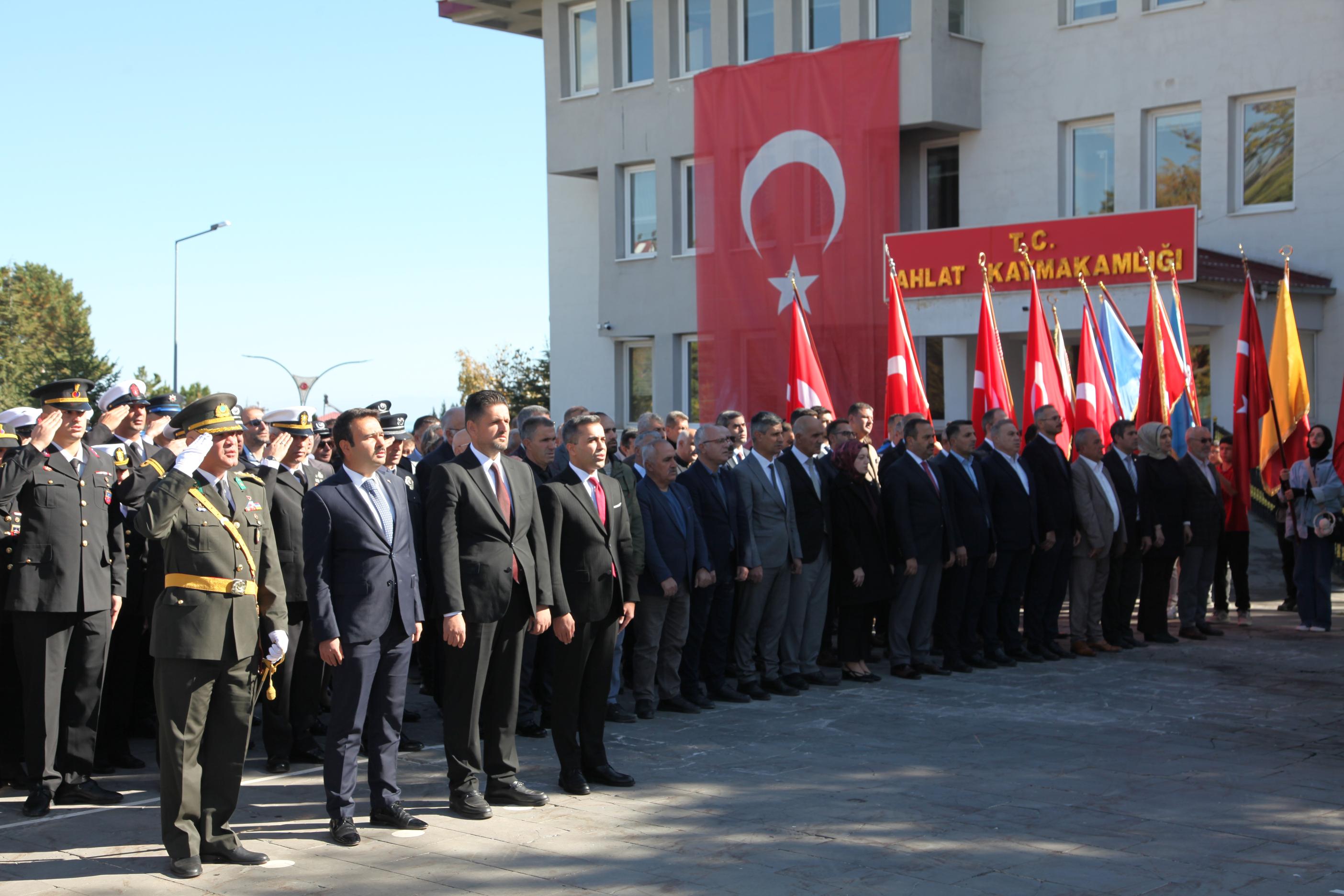 Ahlat Kaymakamlığı önünde Atatürk büstüne çelenklerin sunulmasıyla başlayan program, Saygı Duruşu ve İstiklal Marşı’nın okunmasıyla sona erdi.
