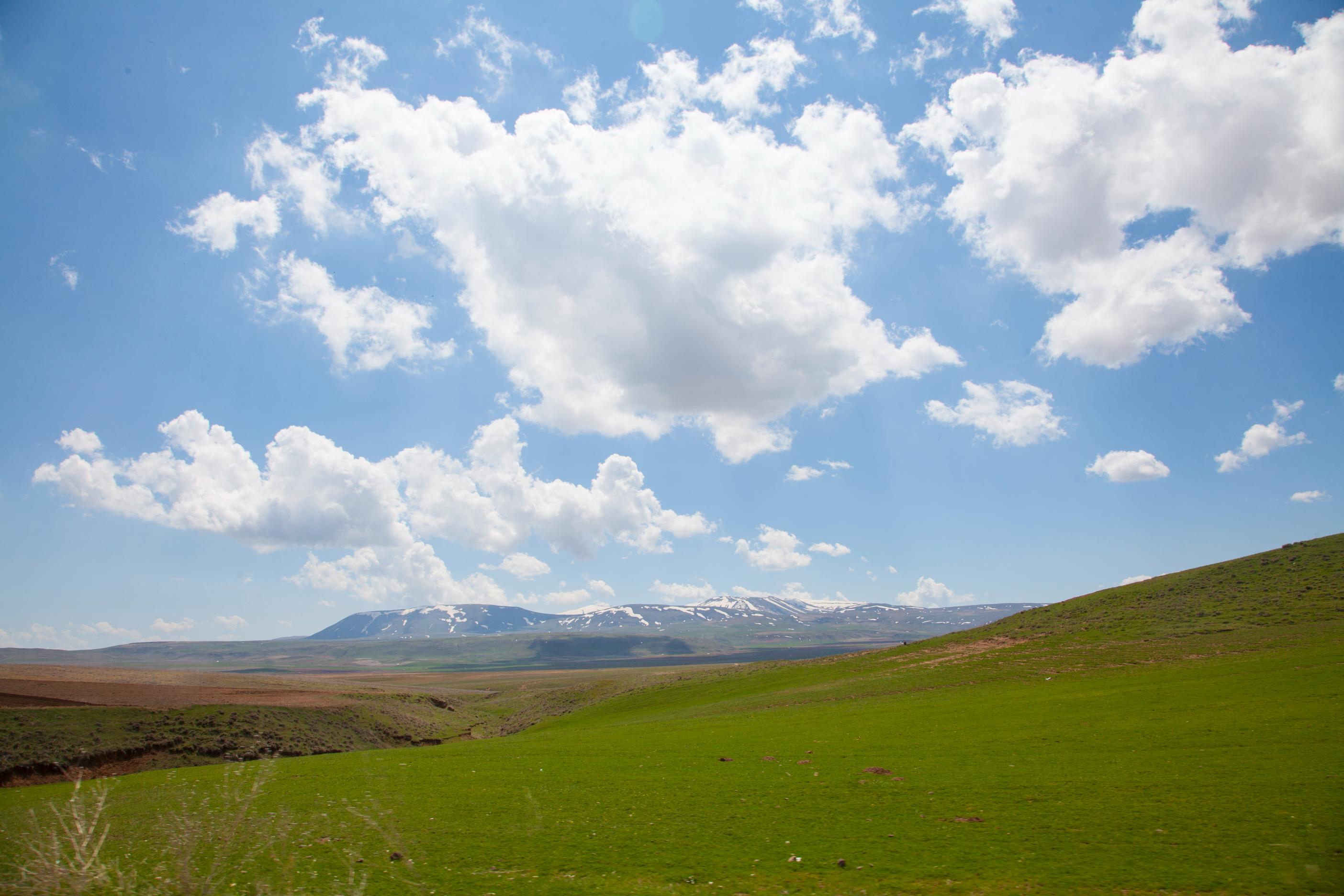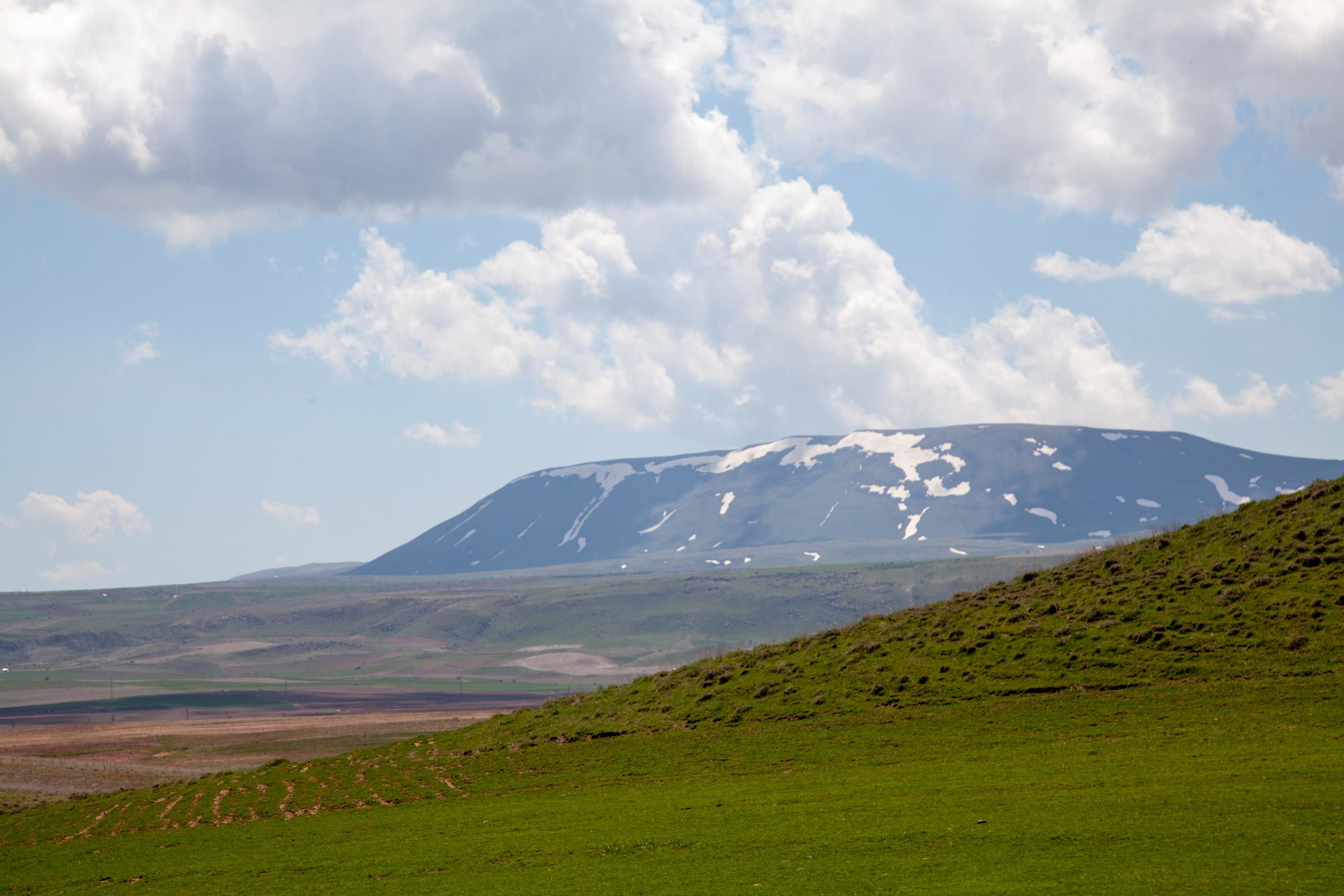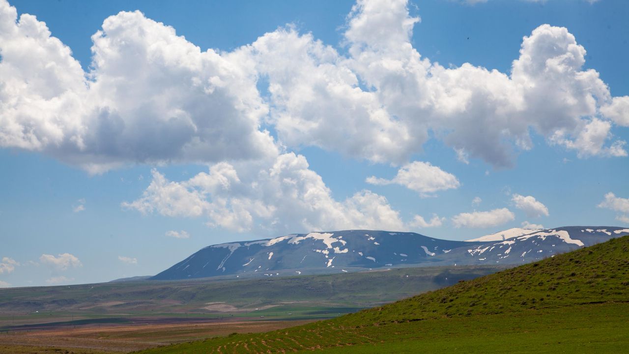 İlçedeki ovalar yemyeşil bir örtüye bürünürken, arka plandaki karlı dağlarla birleşen manzara kartpostallık görüntüler oluşturdu.