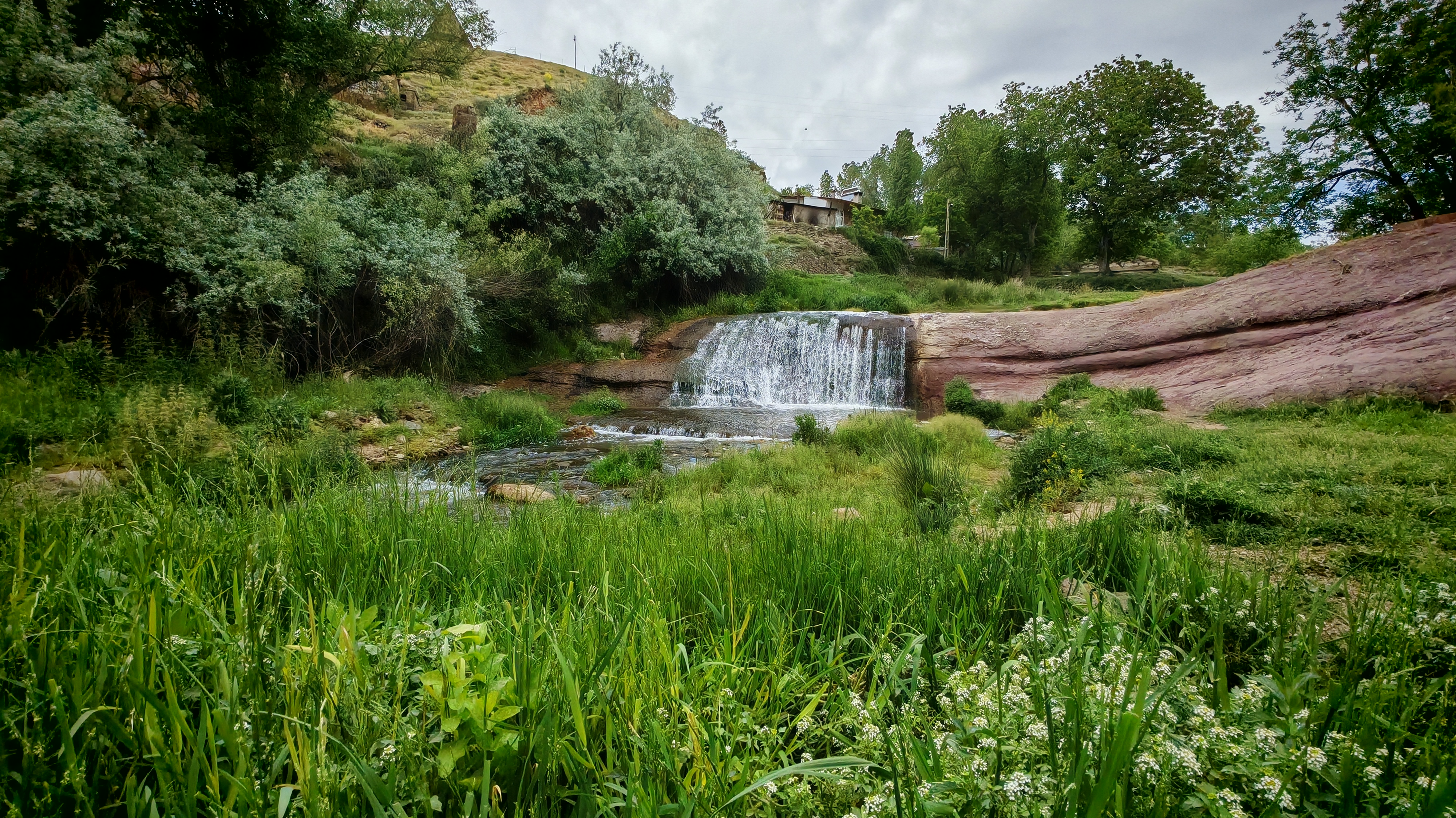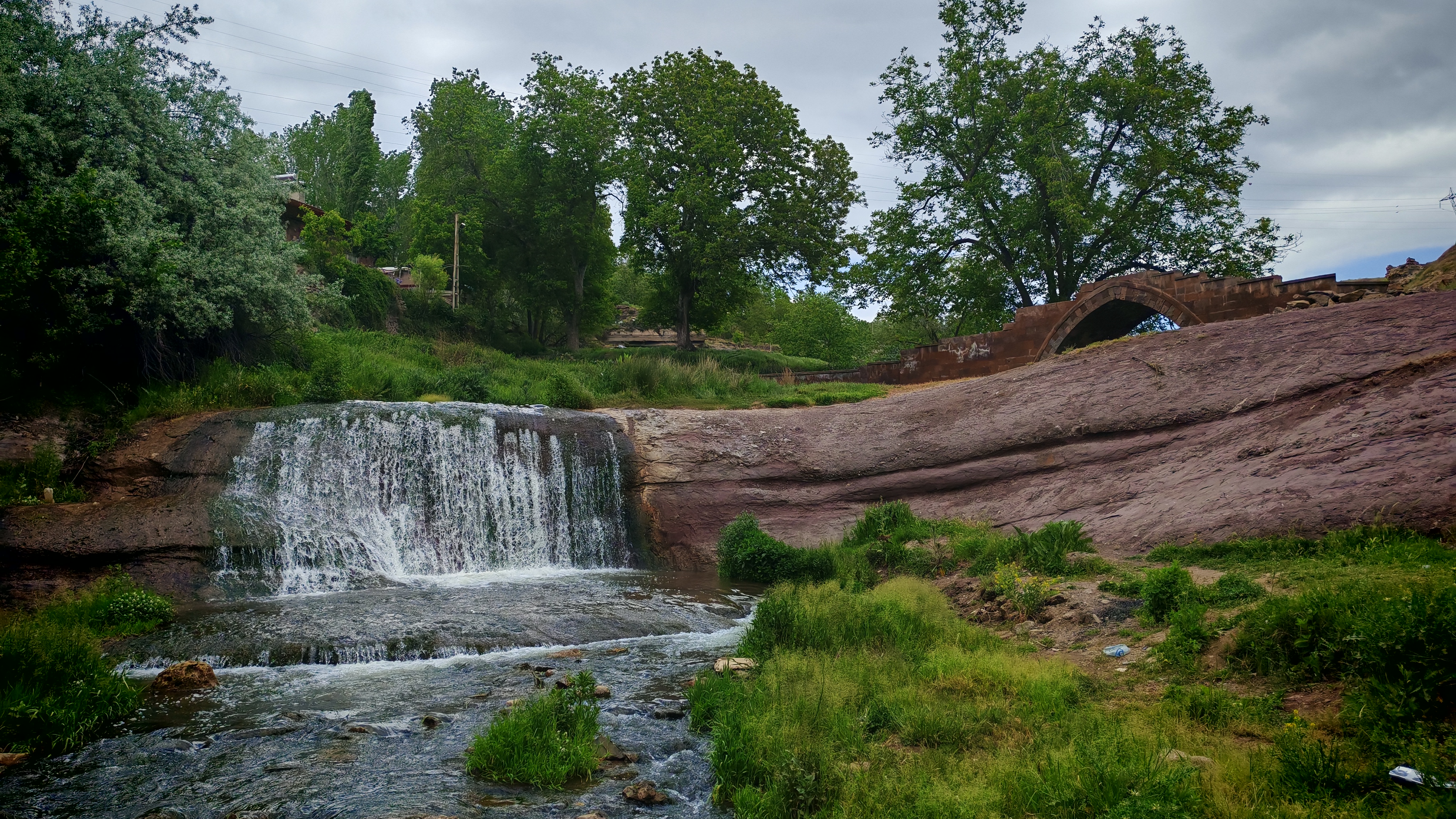 Köprünün altından nazlı nazlı akan mini şelale, etrafını saran yemyeşil bitki örtüsüyle birleşerek doğa ve tarihin eşsiz uyumunu sergiliyor.