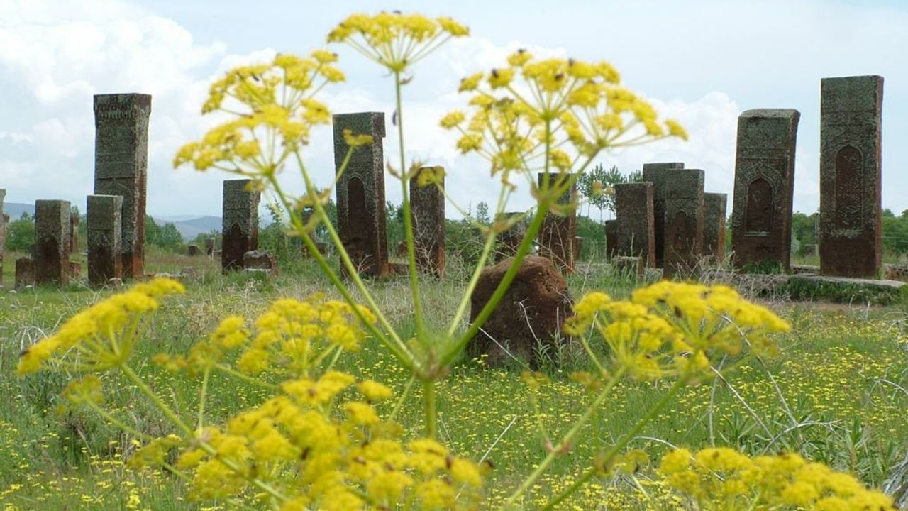 Bitlis’in Ahlat ilçesinde bulunan Selçuklu Mezarlığı, yalnızca bir tarihî alan değil; taşla renk, geçmişle doğa arasında kurulmuş bir görsel uyumun mekânı. 4,5 metreyi bulan şahideler, ejder motifleri ve geometrik süslemeleriyle göğe yükselirken, çevresini saran sarı çiçekler ve yeşil bitkiler bu sessiz tanıklara hayatın devam ettiğini fısıldıyor.