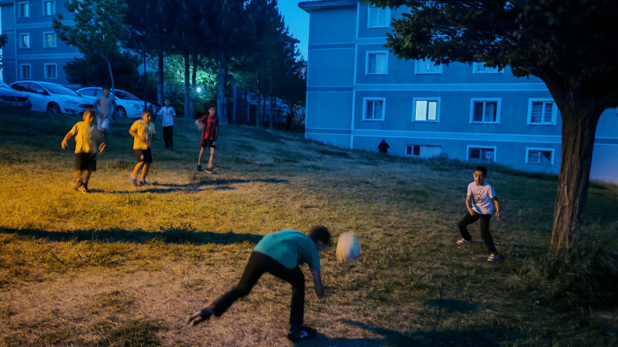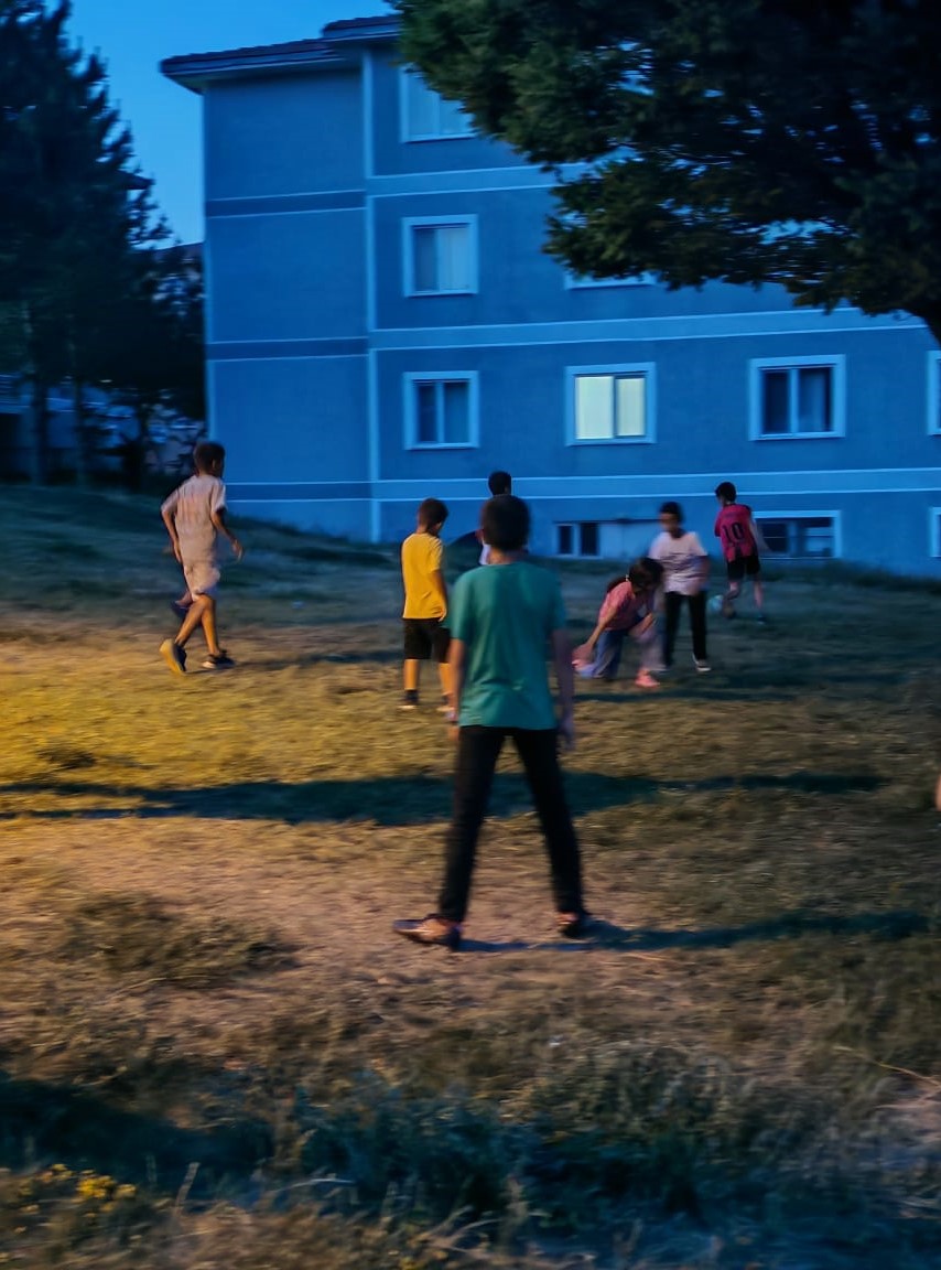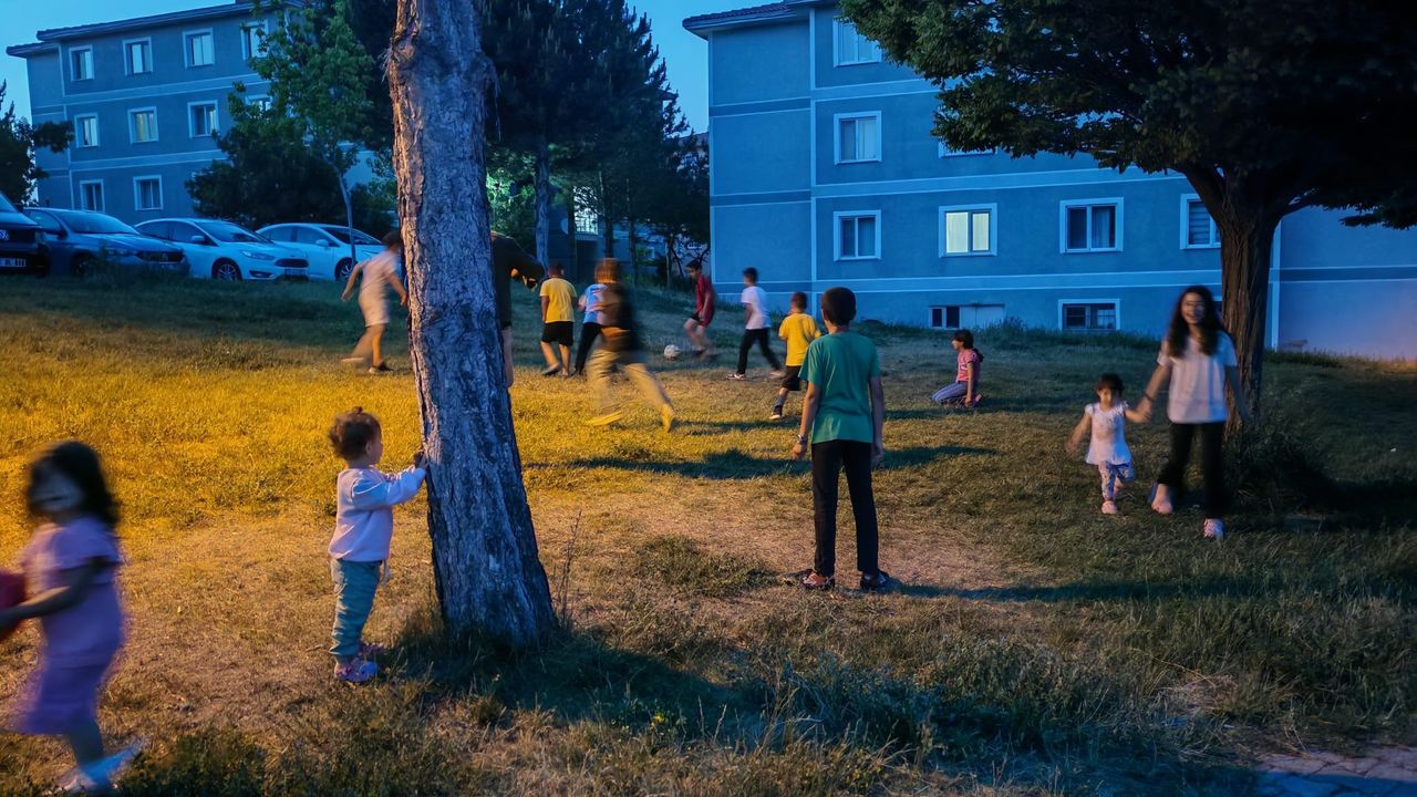 Selçuklu toki deki çocuklar akşamın alacakaranlığında futbol oynamanın keyfini çıkarırken, daha küçük yaştakiler ise ağaçların etrafında kendi oyunlarını kuruyor. Ailelerin evlerinden bu tatlı telaşı izlediği anlar, mahalle kültürünün ve komşuluk ilişkilerinin sıcaklığını yansıtıyor.