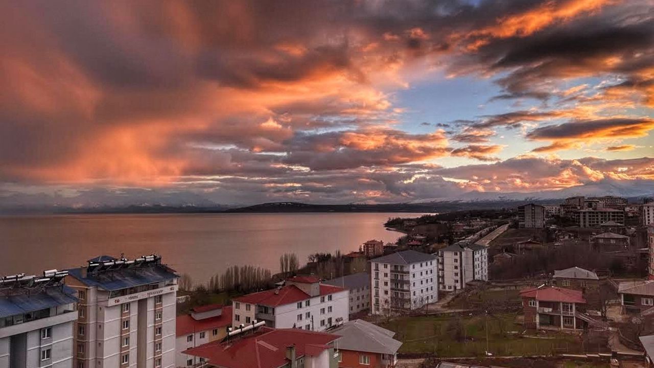 Bitlis’in Ahlat ilçesinde gün batımında gökyüzünde oluşan kızıllık, izleyenleri adeta büyüledi. Son günlerde aralıklarla etkili olan yağışlı havanın ardından akşam saatlerinde ortaya çıkan renk cümbüşü, ilçede görsel şölen oluşturdu. Yağmur bulutlarının güneş ışınlarıyla birleşmesi sonucu gökyüzünde oluşan kızıl tonlar, özellikle Van Gölü kıyısında eşsiz manzaralar sundu. Gün batımına yakın saatlerde bulutların kızıl ve turuncuya bürünen görüntüsü, hem vatandaşların hem de fotoğraf tutkunlarının ilgisini çekti.