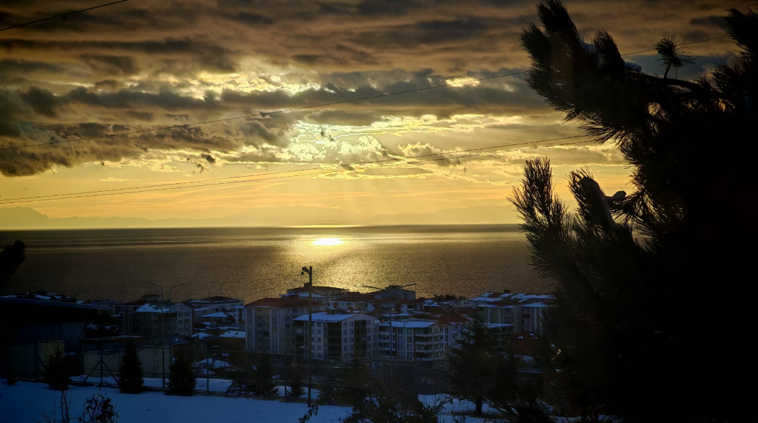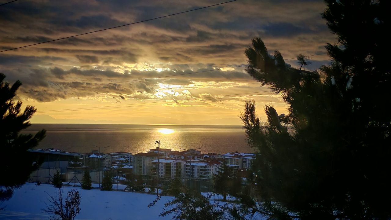Bitlis’in Ahlat ilçesinde etkili olan kar yağışının ardından gün batımı, ortaya çıkan manzarayla izleyenleri kendine hayran bıraktı. Beyaz örtüyle kaplanan düzlükler ve Van Gölü kıyısı, güneşin batarken gökyüzüne bıraktığı kızıl ve turuncu tonlarla bütünleşti.