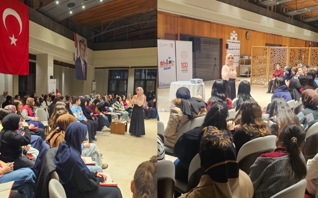 Sosyal hayatta ve kamusal alanda adab-ı muaşeret konulu sunum gerçekleştirmek üzere Ahlat Cumhurbaşkanlığı Külliyesi’ne gelen Diyanet TV sunucusu ve aynı zamanda Milli Eğitim Akademisi Başkanlığı görevlisi Hilal Demir, öğrencilerle bir araya geldi.