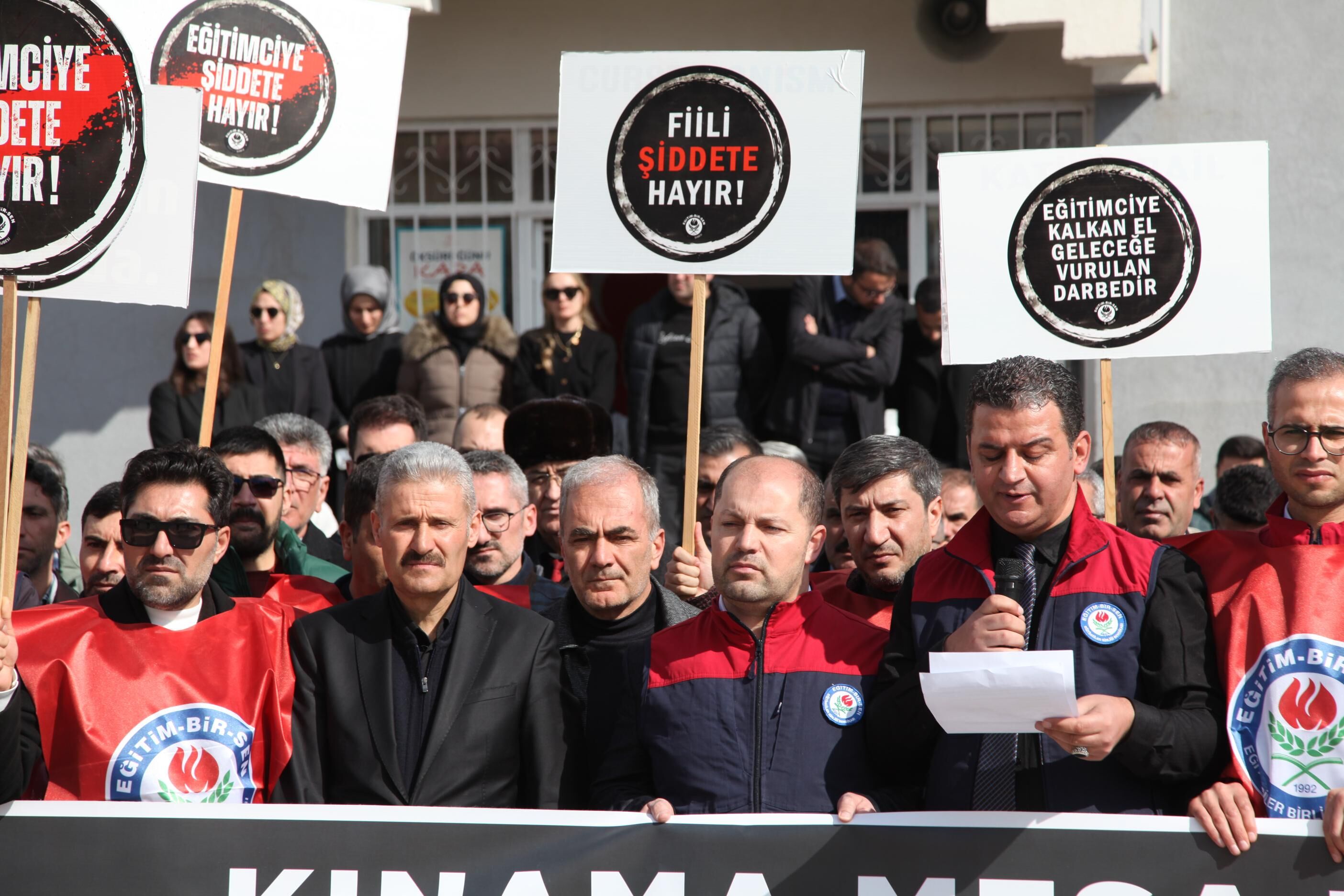 Yaşasın, "Yetkili mercilerden beklentimiz; bu saldırının tüm yönleriyle araştırılması, sorumluların hukuk önünde gerekli cezayı alması ve benzer olayların tekrar yaşanmaması için caydırıcı tedbirlerin ivedilikle hayata geçirilmesidir. Eğitim çalışanlarının güvenliğinin sağlanması yalnızca bireysel bir hak değil, aynı zamanda kamusal bir zorunluluktur. Bugün burada sergilediğimiz birlik ve dayanışma, eğitim çalışanlarının yalnız olmadığının en güçlü göstergesidir. Eğitim camiasına yönelen her türlü saldırının karşısında durmaya, meslektaşlarımızın yanında olmaya ve hukuki sürecin takipçisi olmaya devam edeceğiz. Unutulmamalıdır ki; eğitim çalışanına uzanan el, toplumun geleceğine uzanmış sayılır. Bu vesileyle saldırıya maruz kalan okul müdürü üyelerimize geçmiş olsun dileklerimizi iletiyor, kendilerine ve tüm eğitim camiasına geçmiş olsun diyoruz. Şiddetin olmadığı, güvenli ve saygı temelli bir eğitim ortamı için mücadelemizi kararlılıkla sürdüreceğiz. Kamuoyuna saygıyla duyurulur.”