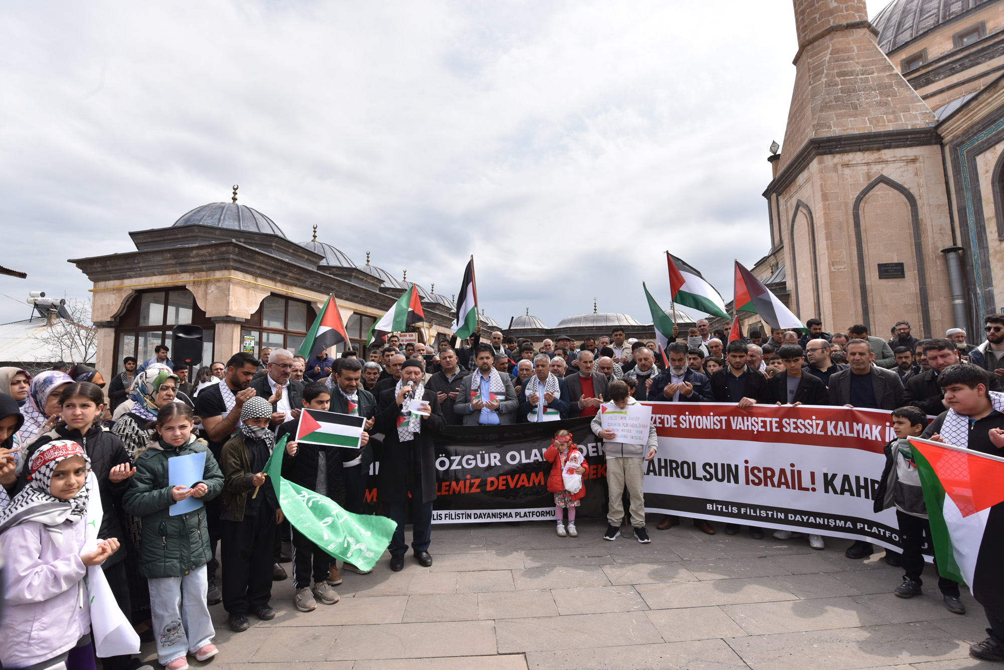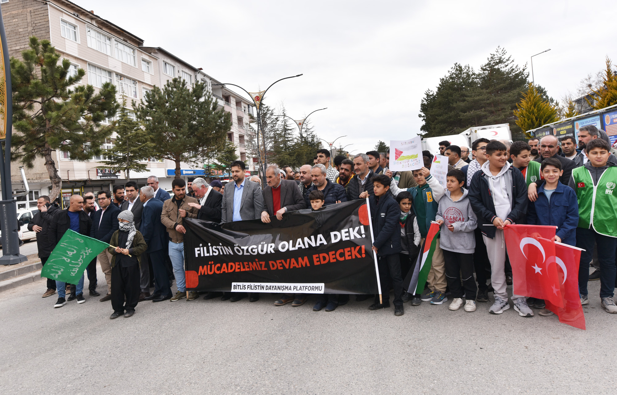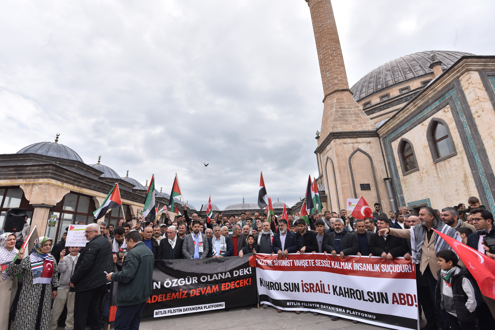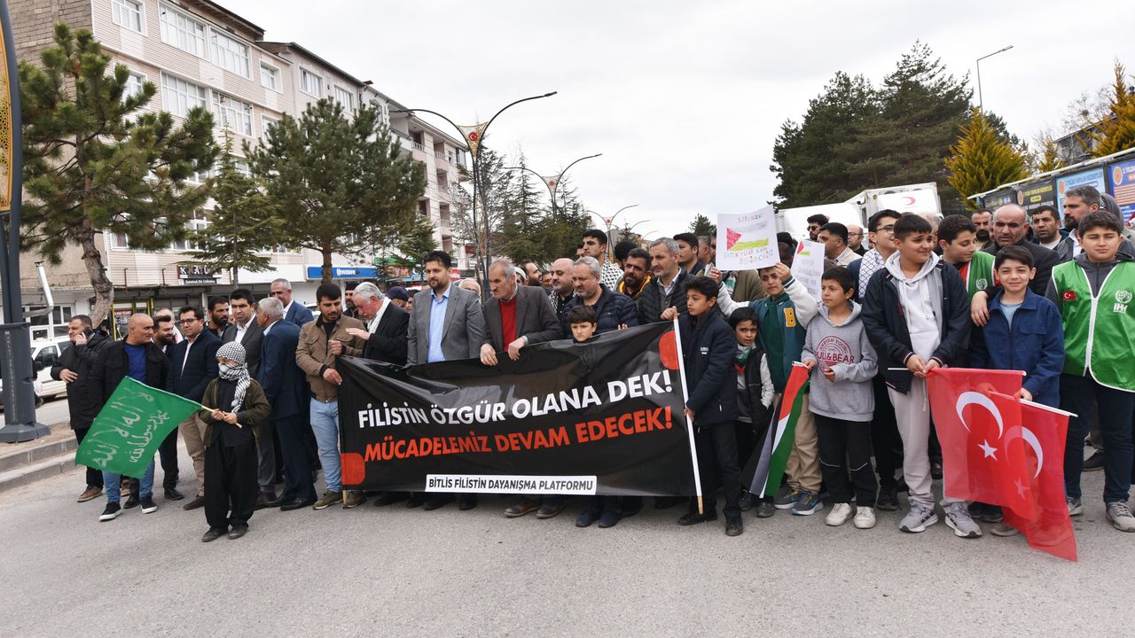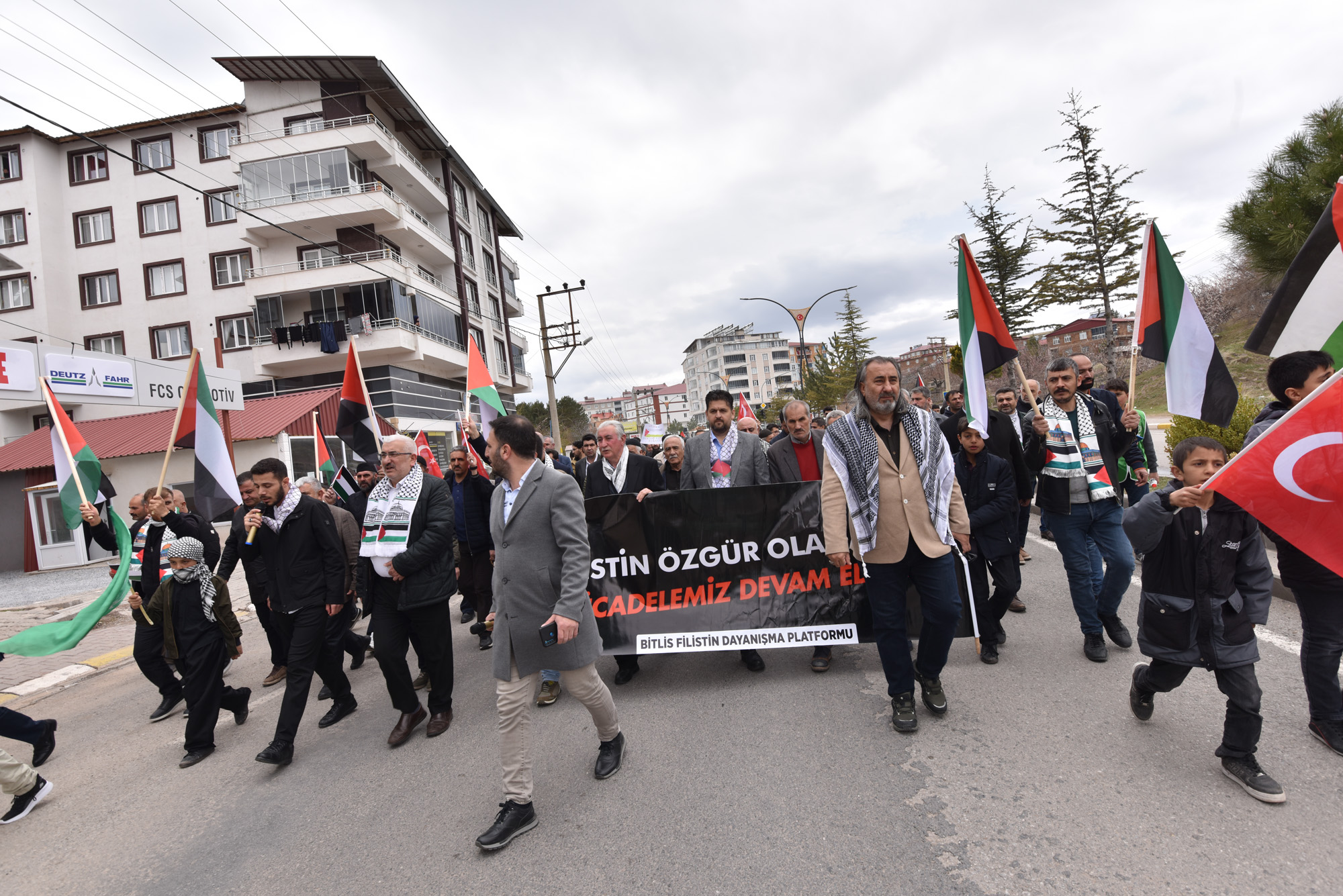 Bitlis Filistin Dayanışma Platformu öncülüğünde düzenlenen yürüyüş İlçenin Yukarı Çarşı AVM önünde başladı. Yürüyüşe katılan kadınlı erkekli yüzlerce vatandaş İsrail’in Gazze’deki saldırılarına tepki göstererek Aşağı Çarşı Ulu Cami önüne kadar yürüdü. Burada Kur’an-ı Kerim okunmasından sonra Bitlis Filistin Dayanışma Platformu adına basın açıklamasını Eren Güneri yaptı.