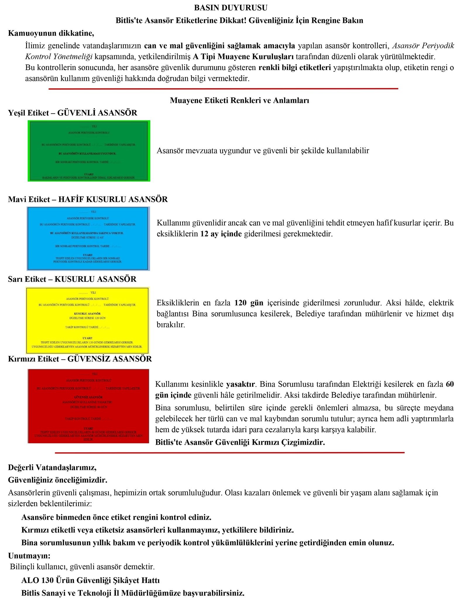 Yetkililer, vatandaşlara asansöre binmeden önce etiket rengini mutlaka kontrol etmeleri ve kırmızı etiketli ya da etiketsiz asansörleri kullanmamaları uyarısında bulundu. Böyle durumlarda ilgili kurumlara bilgi verilmesi istenirken, bina sorumlularının da bakım ve periyodik kontrolleri zamanında yaptırmaları gerektiği vurgulandı.