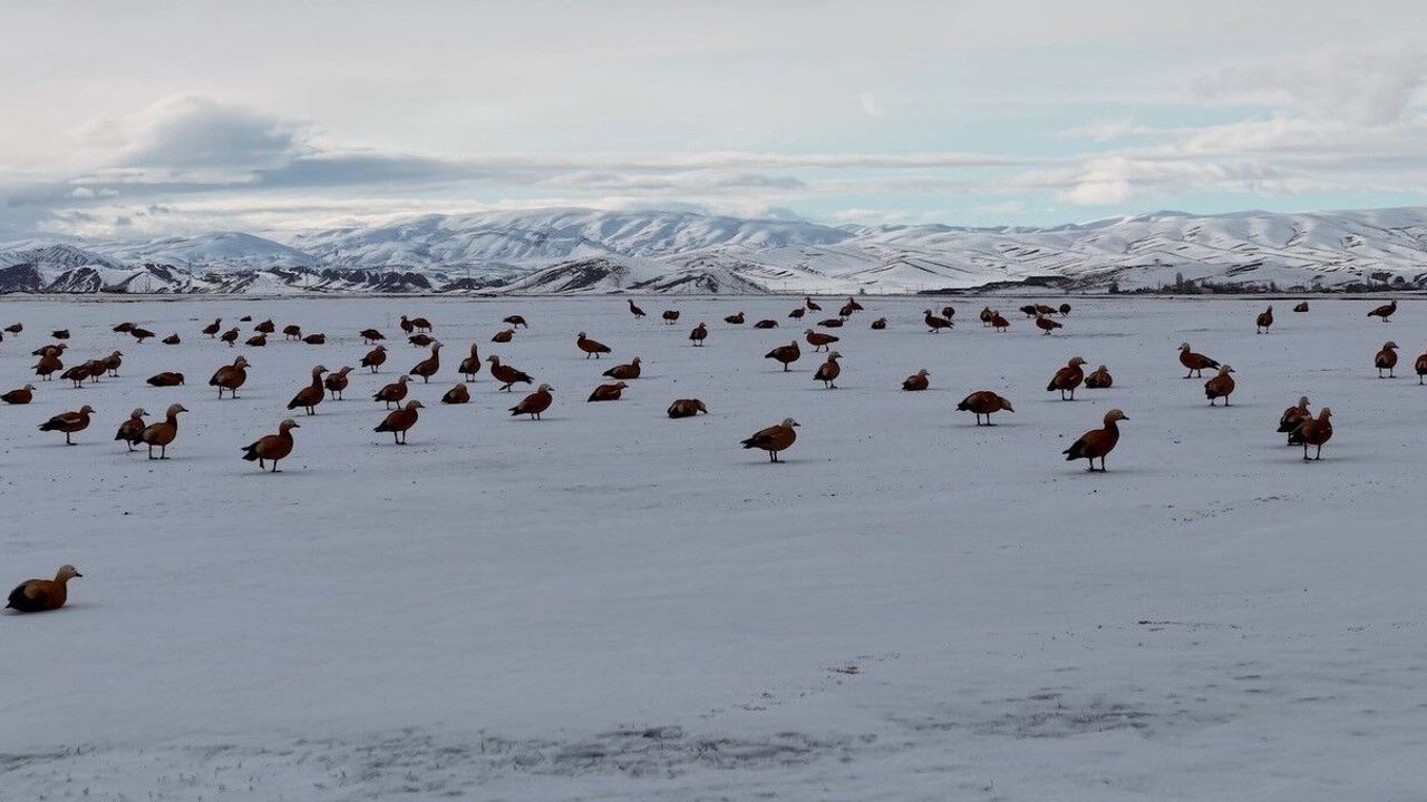 Görüntü yönetmeni Mustafa Başgöze tarafından drone ile kaydedilen görüntülerde, ördek türü olan angut kuşlarının Erzincan Ovası'nda karlı arazide sürü halinde dolaştığı görüldü.