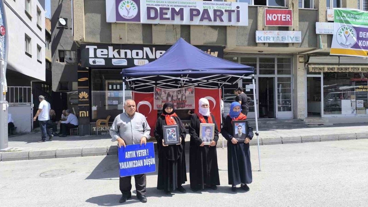 Muş’ta çocukları terör örgütü PKK tarafından kaçırılan aileler, DEM Parti İl Başkanlığı binası önünde eylemlerine devam ediyor. Her hafta çarşamba günü DEM Parti binası önünde bir araya gelen aileler, evlatlarına kavuşacakları günü umutla bekliyor. PKK’nın silah bırakmasını ve "Terörsüz Türkiye" sürecini memnuniyetle karşılayan aileler, eylem boyunca fotoğraflarını taşıdıkları çocuklarına "teslim ol" çağrısında bulundu.