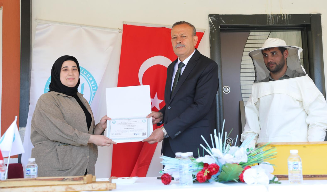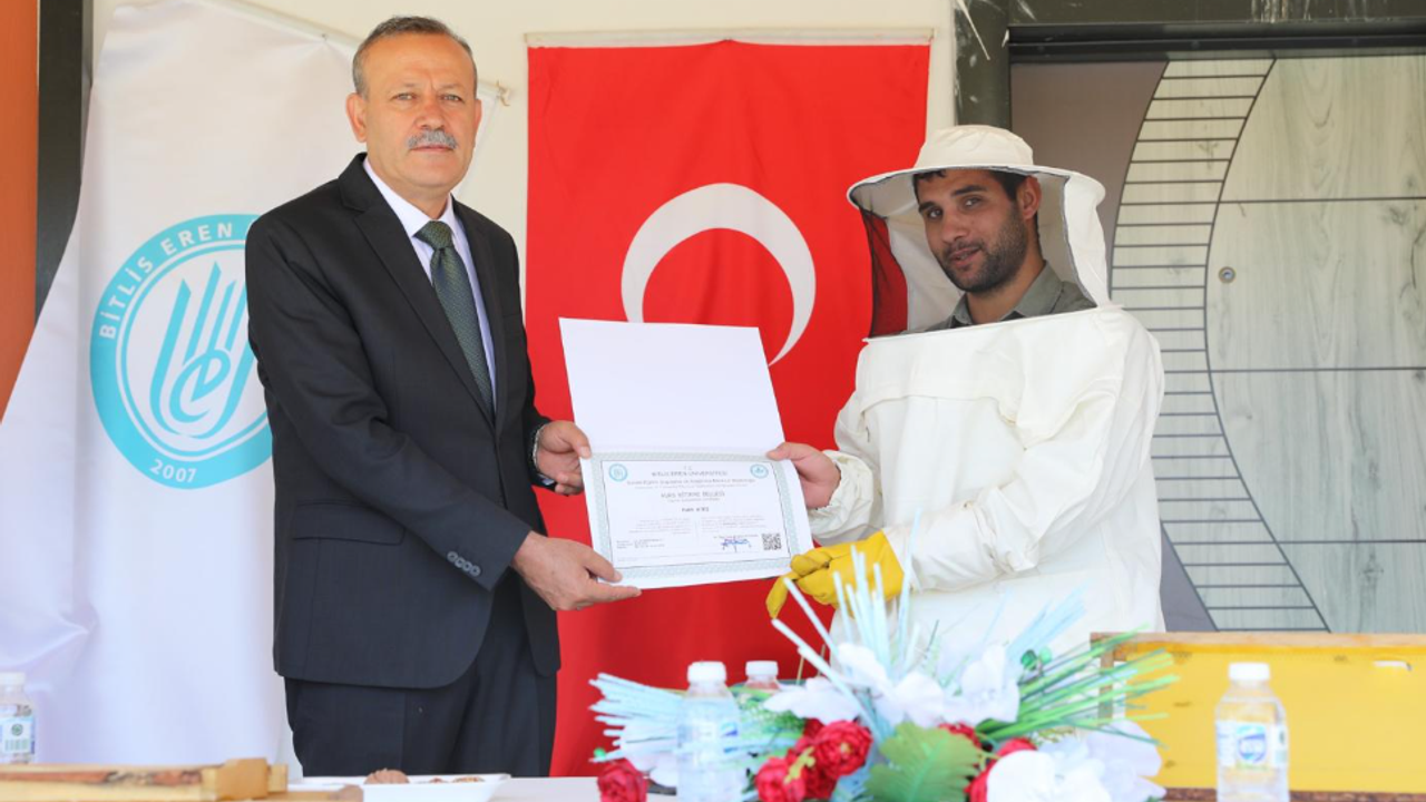 Bitlis Eren Üniversitesi Sürekli Eğitim Uygulama ve Araştırma Merkezi Müdürlüğü ile Arı ve Arı Ürünleri Geliştirme Uygulama ve Araştırma Merkezi Müdürlüğü iş birliğinde düzenlenen “Arıcılık Kursu”nu başarıyla tamamlayan kursiyerlere sertifikaları, Üniversite Rektörü Prof. Dr. Necmettin Elmastaş tarafından takdim edildi.