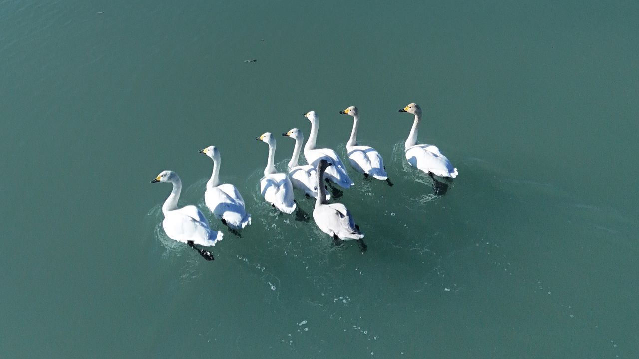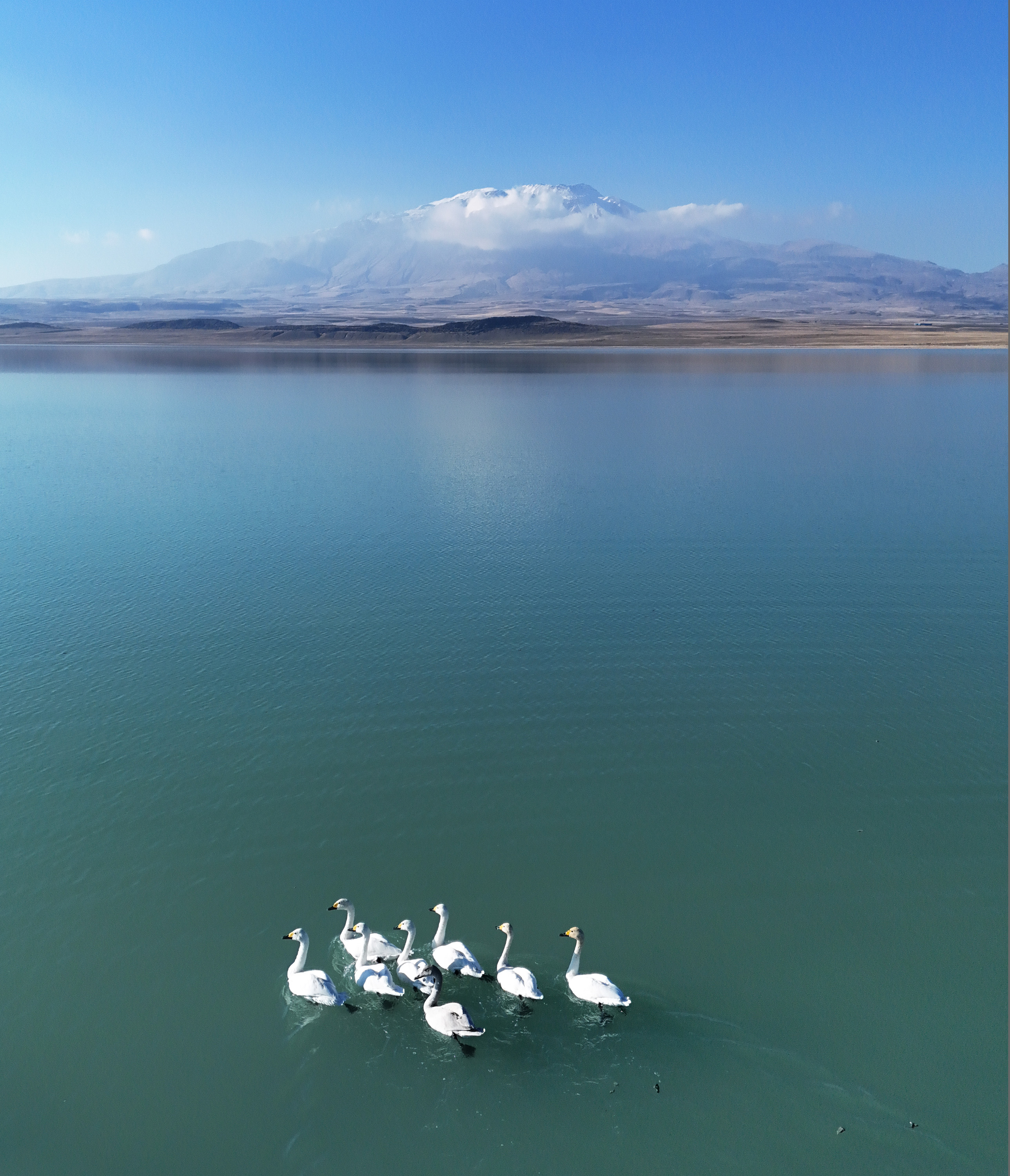 Yaklaşık 200 farklı kuş türüne ev sahipliği yapan Arin Gölü, havaların soğumasıyla birlikte önemli bir göç durağı olarak yeniden canlandı. Bu dönemde göle gelen ötücü kuğular, sakin ve etkileyici duruşlarıyla izleyenleri adeta büyülerken, dronla çekilen görüntüler doğanın sunduğu eşsiz güzelliği gözler önüne serdi.