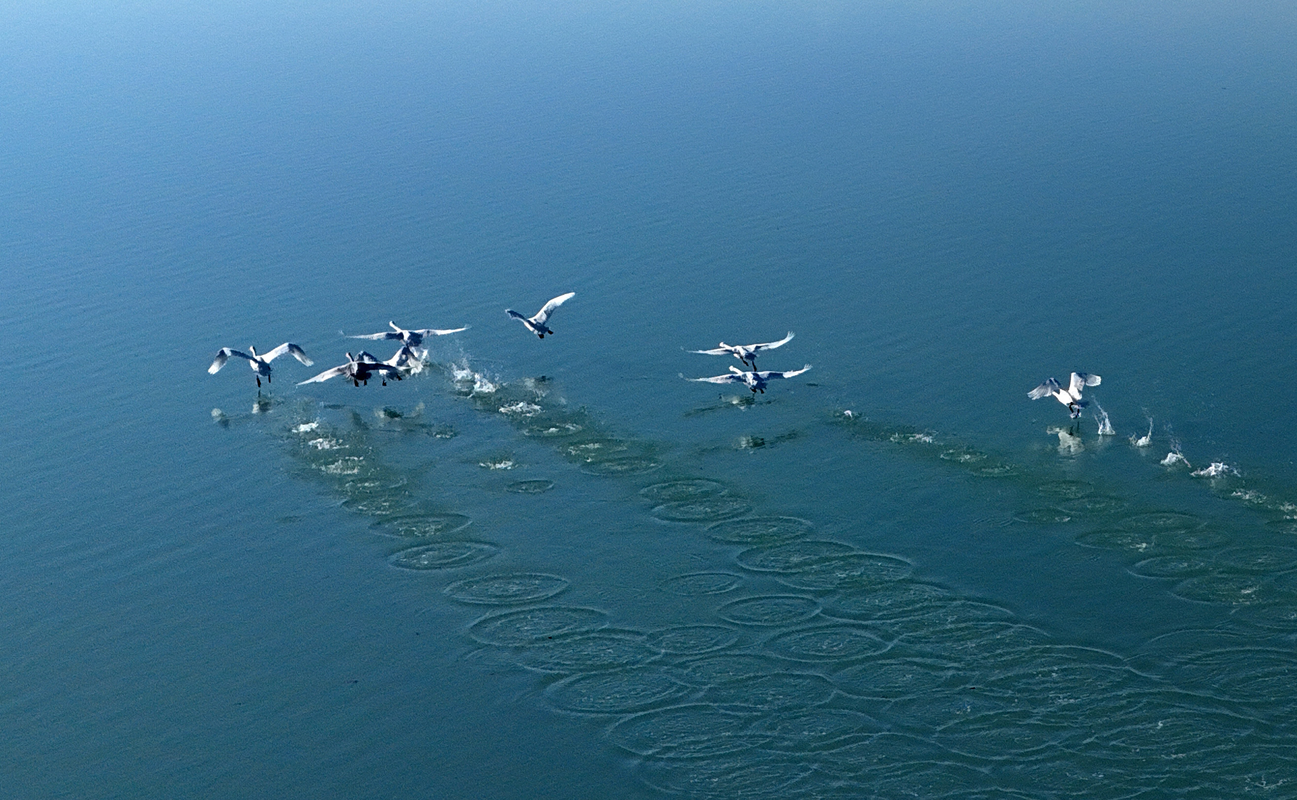 Yaz aylarında gölü pembe tonlara bürüyen flamingoların göç etmesiyle bölgede hâkimiyet beyaz renkli ötücü kuğulara geçti.