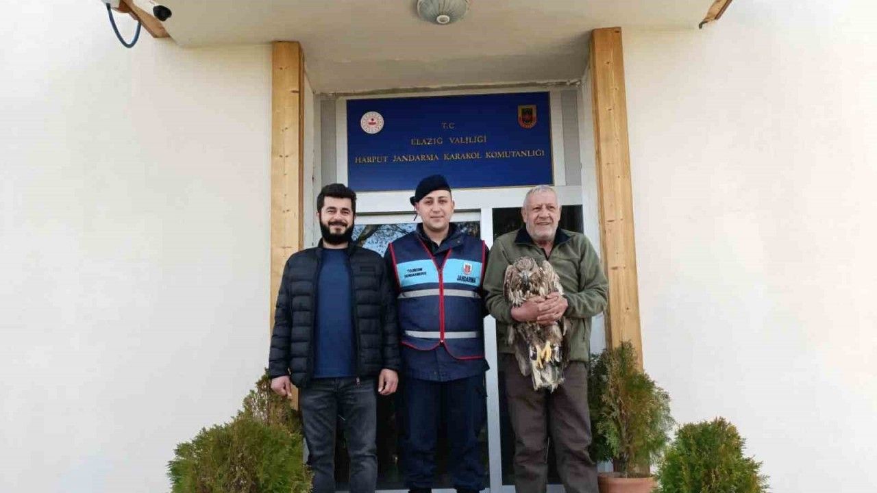 Elazığ’da köy yolu üzerinde jandarma ekiplerince yaralı olarak bulunan kaya kartalı, Doğa Koruma ve Milli Parklar Şube Müdürlüğü ekiplerine teslim edildi.