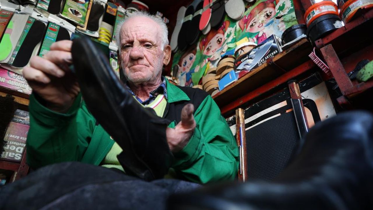 Elazığ’da 73 yaşındaki Hasan Aydın, 2 metrekarelik barakada 45 yıldır babasından devraldığı ayakkabı boyacılığı mesleğini sürdürüyor.