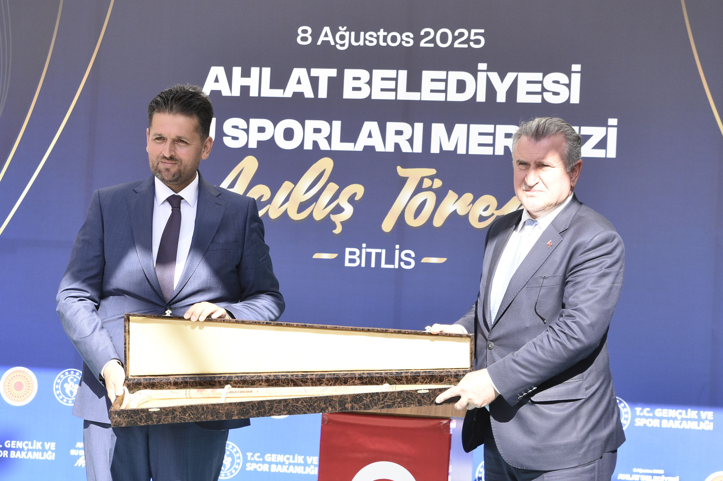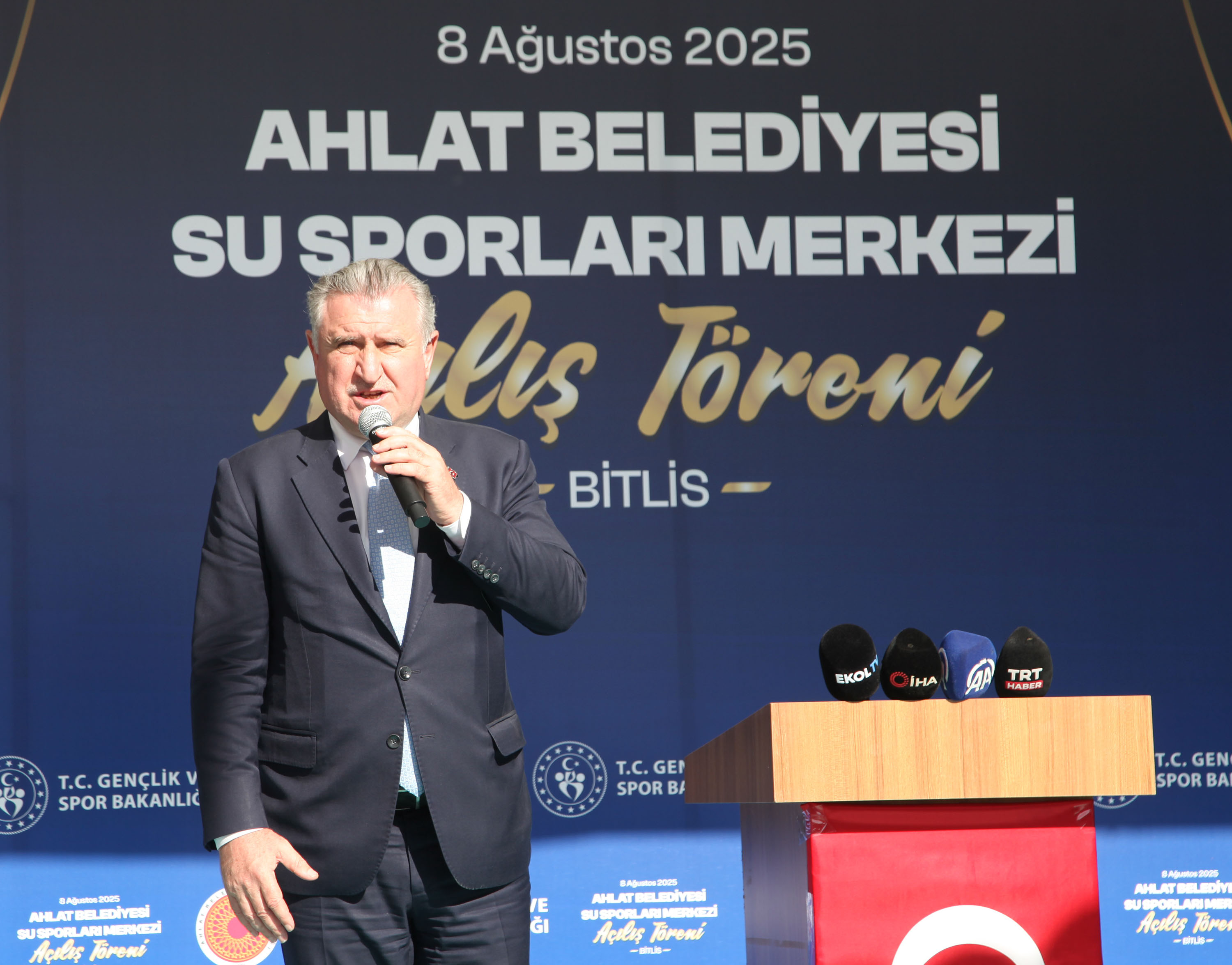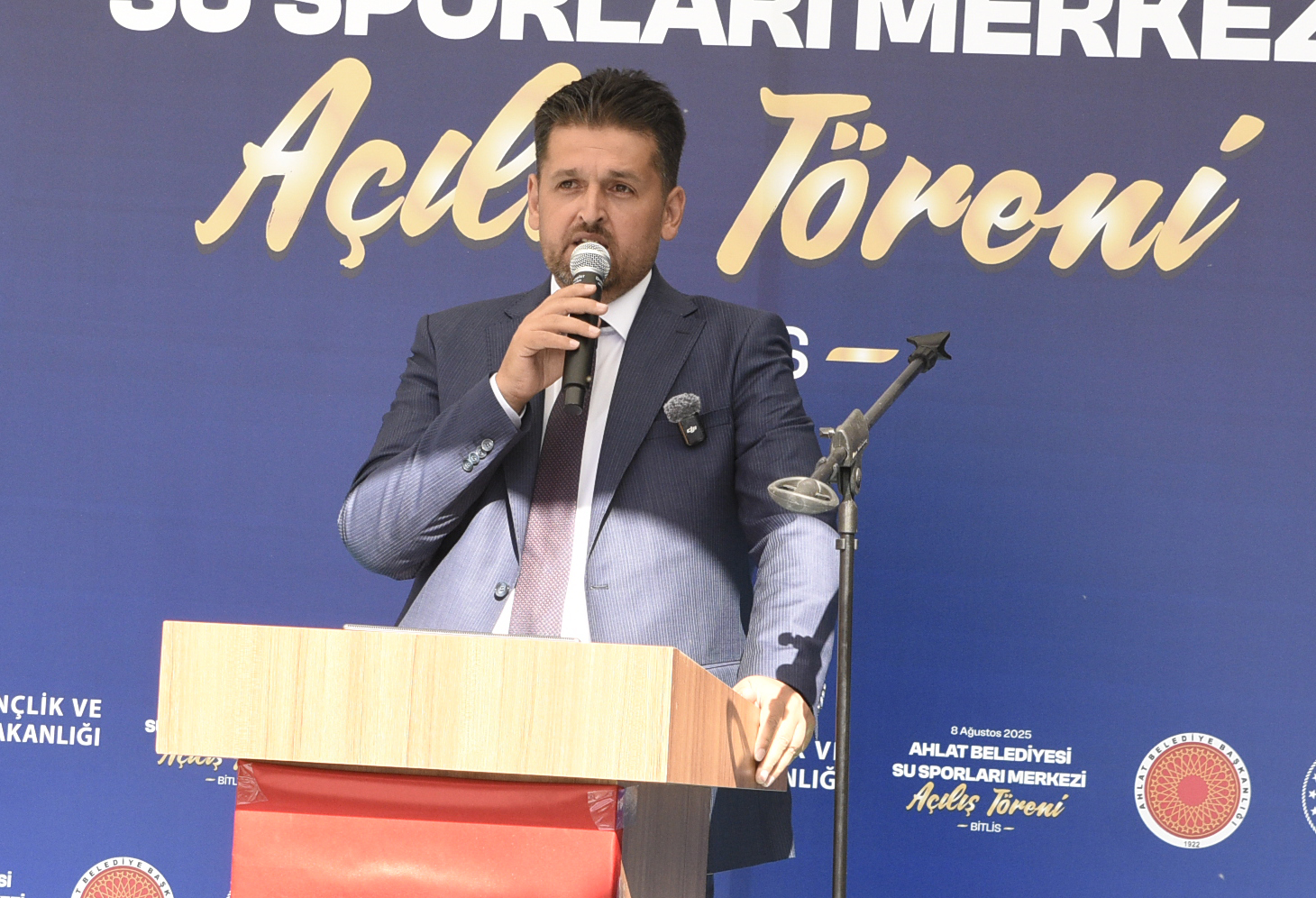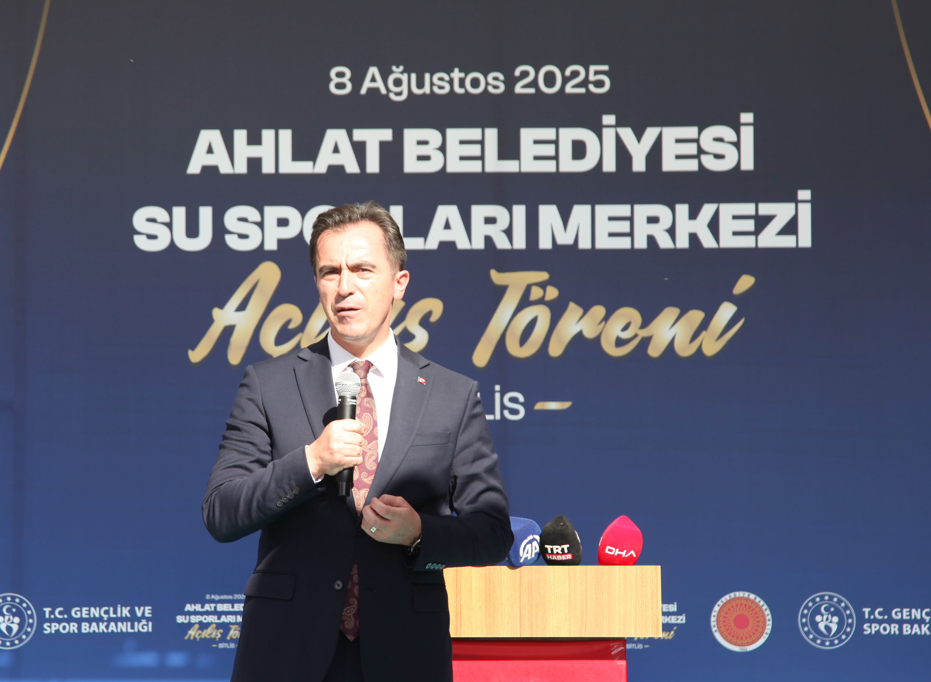 Ahlat’ın Tunus Mahallesi’nde Van Gölü kenarında inşa edilen Su Sporları Merkezi açılışında konuşan Gençlik ve Spor Bakanı Osman Aşkın Bak, “Gençlik ve Spor Bakanlığı olarak Bitlis’te çeşitli yatırım protokollerini imzalamak ve yeni yatırımların müjdesini vermek üzere geldik. Güroymak’ta bir gençlik merkezi için protokol imzaladık. Hizan’a salon ve yüzme havuzu başta olmak üzere yatırımlar, halı sahalar, Bitlis merkezde yaptığımız halı sahalar ile ilgili protokoller, yine Adilcevaz’da yarı olimpik bir yüzme havuzu için buradayız. Ve Bitlis’te güzel projelere devam edeceğiz. Gençlik ve Spor Bakanlığı olarak Türkiye’nin her yerinde spor yatırımları yapıyoruz. Sayın Cumhurbaşkanımızın sporun içinden gelmesi, gençlere spor alanında yatırımlar yapması, gençlere güvenmesi ve Türkiye’nin dört bir yanındaki mahallelerden tutun da köylerine kadar spor tesisleri kazandırılması için verdiği talimatlar doğrultusunda çalışmaya devam ediyoruz. Türkiye’de modern stadyumlar, kapalı spor salonları ve yüzme havuzları başta olmak üzere Atletizm pistleri ve gençlik kampları pek çok yatırım yapıldı, yapılmaya devam ediyor. Bütün bunlar ülkemizin güzel gençleri için. Gençlik ve Spor Bakanlığı olarak bizim en büyük görevlerimizin bir tanesi de gençlerin sporla buluşmasıdır. Kötü alışkanlıklardan uzak durması, başta dijital bağımlılık, uyuşturucu ve içki olmak üzere gençlerimizi bağımlı hale getiren alışkanlıklardan uzak tutulmasıdır. Buradan ailelere sesleniyorum; çocuklarınızı yüzme havuzlarımıza spor tesislerimize spor alanlarımıza getirelim. Onların yaz spor okulları ve kulüplerimizle hizmet etmeye devam ediyoruz” dedi.