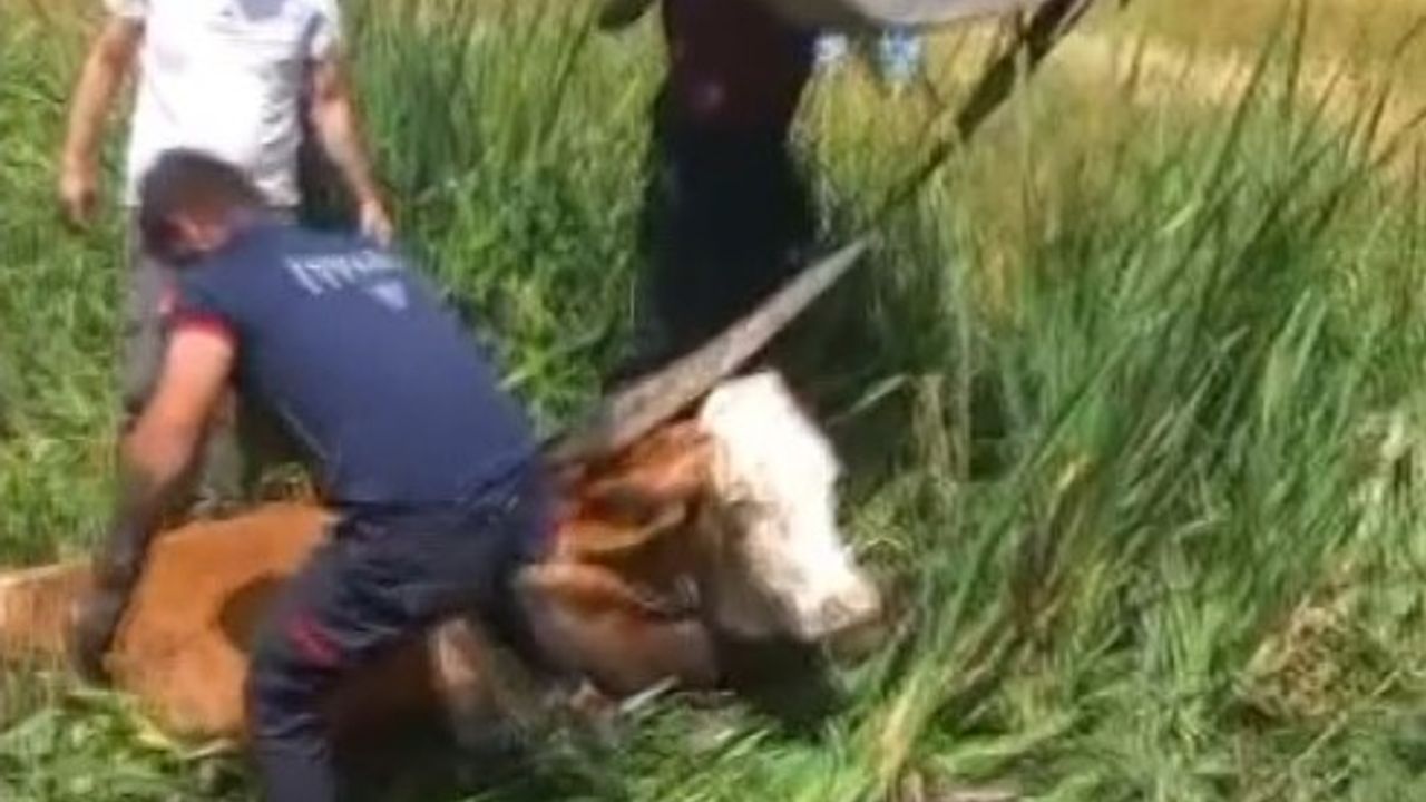 Muş’ta bataklığa saplanan iki büyükbaş hayvan, itfaiye ekiplerinin titiz çalışmasıyla kurtarıldı.