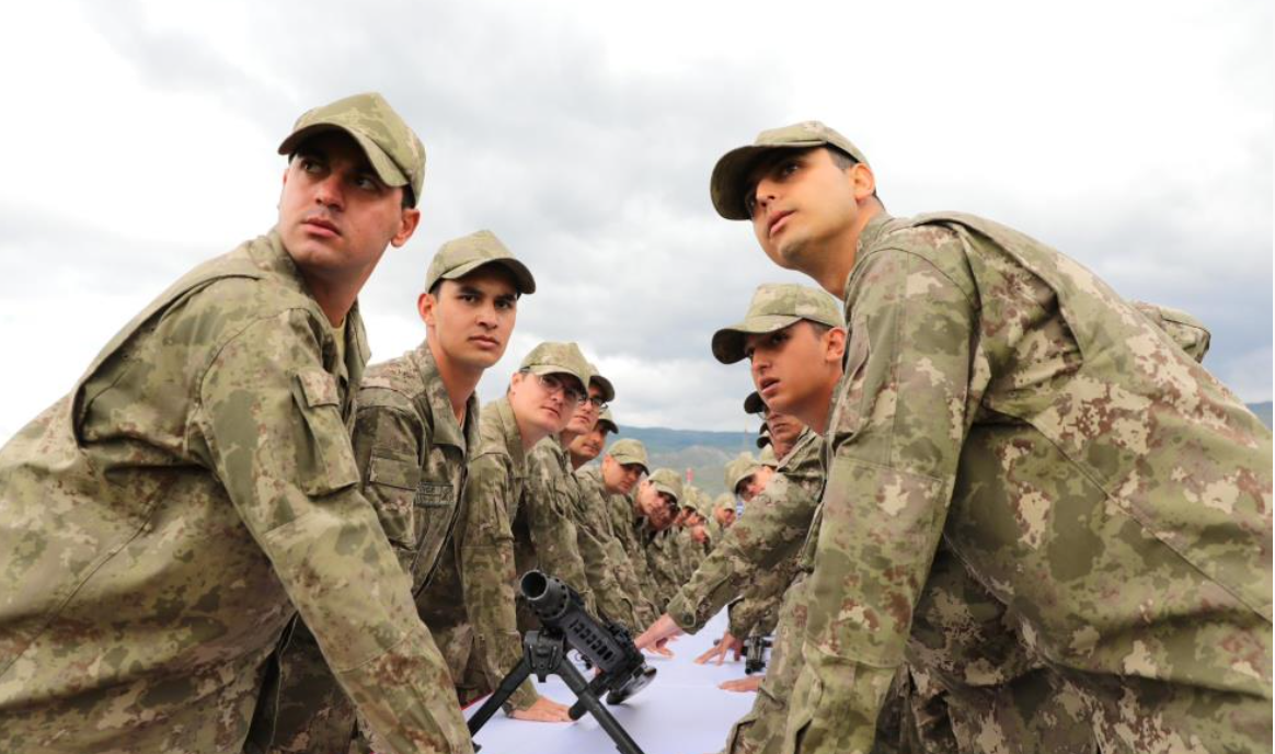 Silahlar ve Türk bayraklarının bulunduğu masaların etrafında sıralanan askerler, Türk bayrağı ile silah üzerine el basarak yemin etti. Türkiye’nin dört bir yanından gelen aileler, evlatlarının yemin törenini izledi.