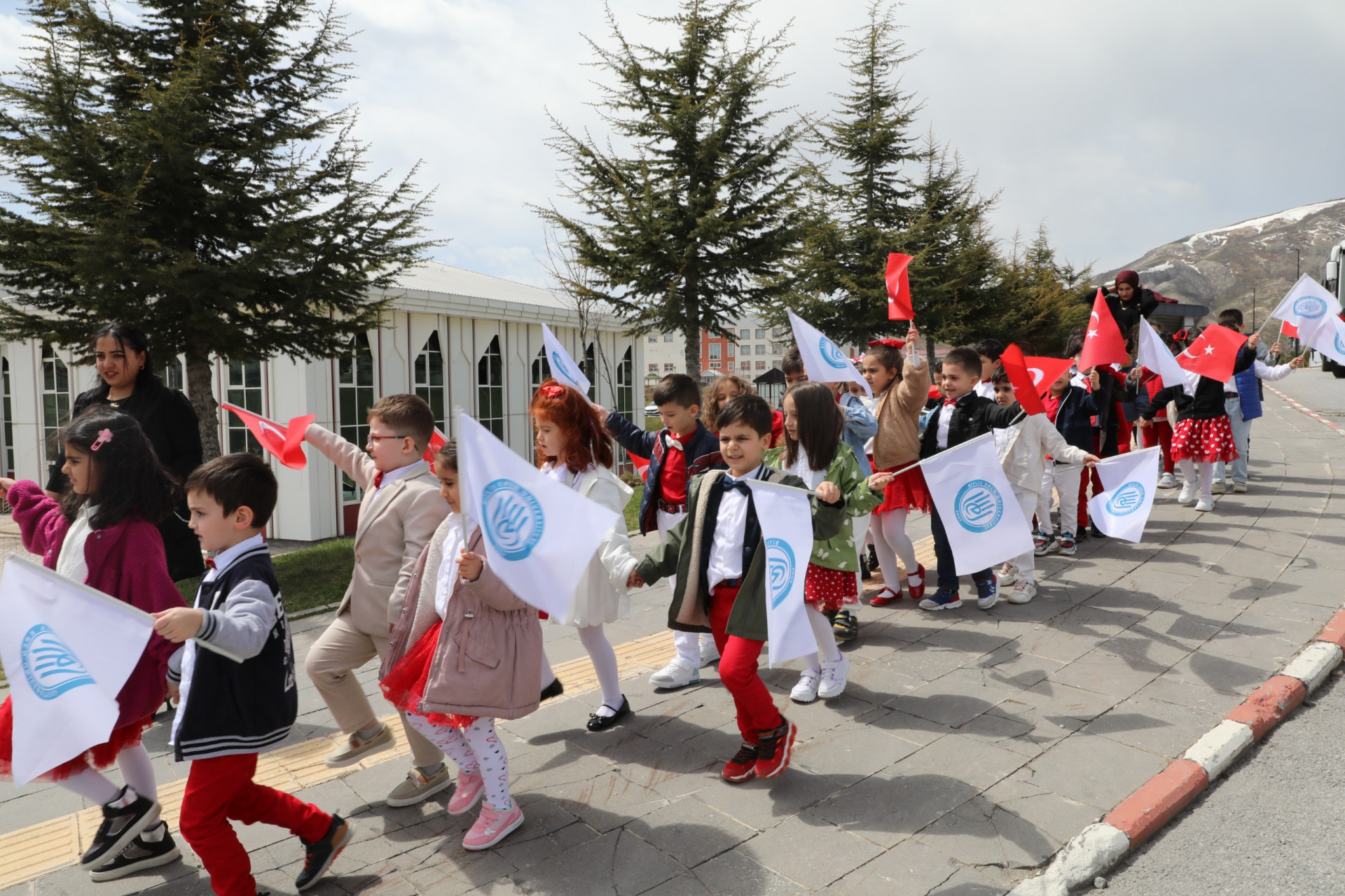 Bitlis Eren Üniversitesi (BEÜ) Sağlık Hizmetleri Meslek Yüksekokulu Uygulamalı Kreş ve Anaokulu öğrencileri, 23 Nisan Ulusal Egemenlik ve Çocuk Bayramı’nı büyük bir heyecan ve neşeyle kutladı. Kampüs içerisinde ellerinde Türk bayraklarıyla yürüyüş yapan minikler, marşlar eşliğinde Rektörlük binasına ulaştı. Burada Rektör Prof. Dr. Necmettin Elmastaş ve beraberindeki protokol üyeleriyle bir araya gelen öğrenciler, “Bizim Bayramımız” adlı şiiri hep birlikte okuyarak duygu dolu anlar yaşattı. Protokol üyeleri, şiir performanslarıyla takdir toplayan miniklere çeşitli hediyeler takdim etti.