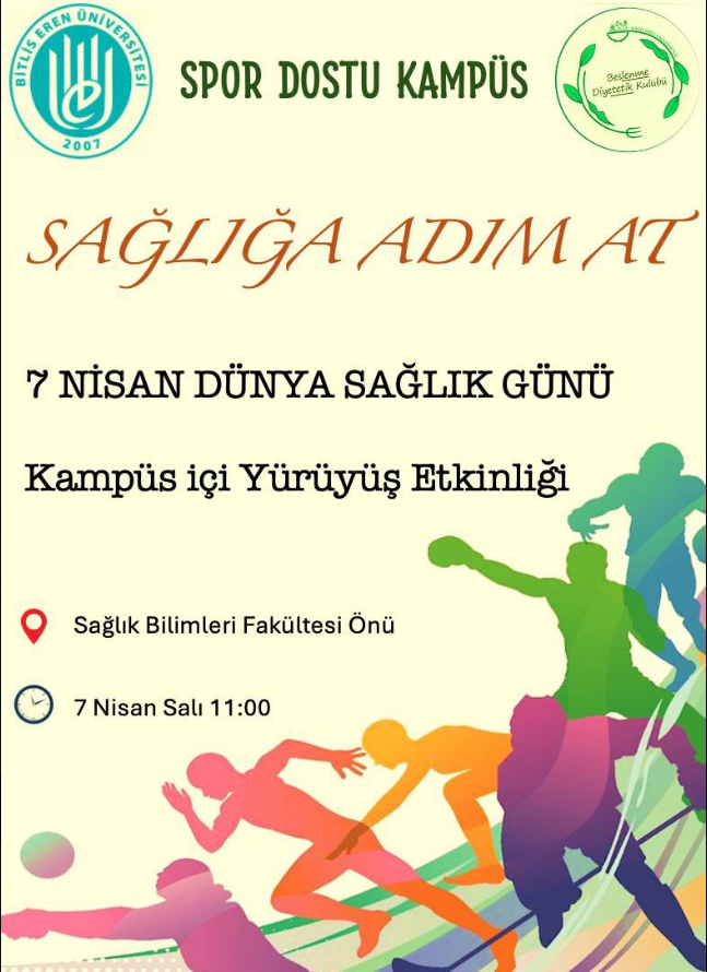 Bitlis Eren Üniversitesi’nde sağlık farkındalığını artırmak amacıyla düzenlenen “Sağlığa Adım At” etkinliği için geri sayım başladı. 7 Nisan Dünya Sağlık Günü kapsamında organize edilen etkinlik, üniversite öğrencileri başta olmak üzere tüm katılımcılara açık olacak. Kampüs içinde gerçekleştirilecek yürüyüşle sağlıklı yaşamın önemine dikkat çekilmesi hedefleniyor. Etkinlik hem fiziksel aktiviteyi teşvik etmeyi hem de toplumsal farkındalık oluşturmayı amaçlıyor.