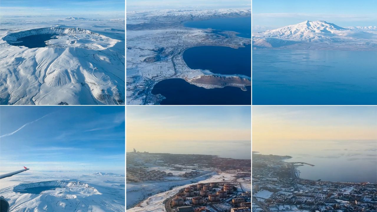 İstanbul-Van seferini yapan yolcu uçağındaki bir yolcu Van Gölü havzasındaki yerleşim alanlarını uçağın penceresinden cep telefonu ile kaydetti. İstanbul’dan Van’a uçakla seyahat eden Ramazan Gülmüş adlı vatandaş Van havaalanına doğru inişe başlayan uçak penceresinden Bitlis ve Van illerini içine kapsayan Van Gölü havzasındaki doğal güzellikleri ve yerleşim yerlerini cep telefonu ile kaydetti. Gülmüş tarafından çekilen görüntülerde Bitlis’in Ahlat, Güroymak ve Tatvan ilçe sınırları içinde bulunan Avrupalı Seçkin Destinasyonlar (EDEN) projesi kapsamında 'Mükemmeliyet Ödülü' sahibi olan 2 bin 250 rakımlı Nemrut Dağı ve Krater Gölü, Tatvan ilçesine bağlı Kıyıdüzü Köyü ile Sarıkum Köyü, Ahlat ilçesi ve Adilcevaz ilçe sınırlarında bulunan Süphan Dağı ile Van’ın Edremit ilçesinin karla bütünleşen görüntüleri kaydedildi. Kar yağışı sonrası beyaza bürünen alanların havadan çekilen görüntüsü hayranlık uyandırdı.
