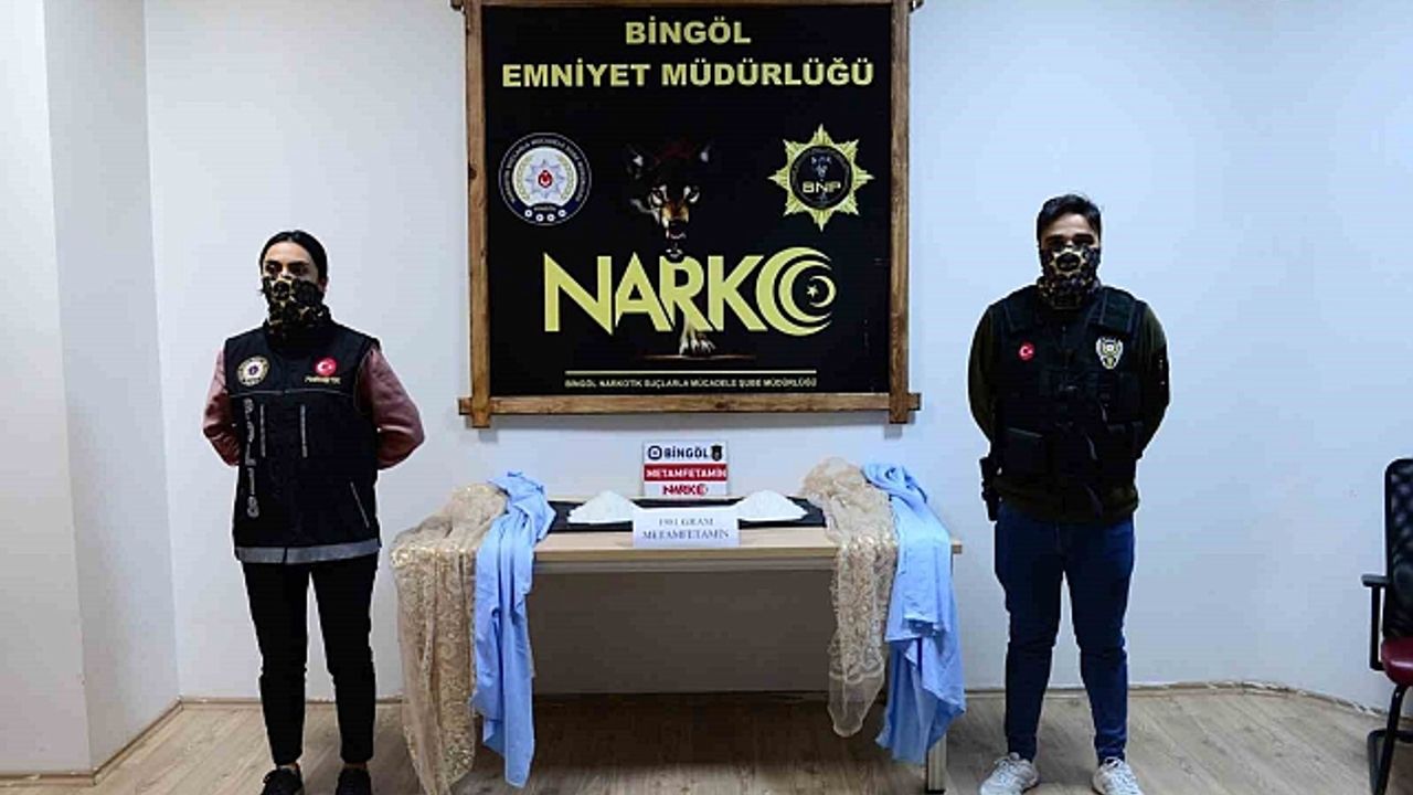 Bingöl'de polis ekiplerince düzenlenen operasyonda, kargo poşeti içerisindeki perdelerin arasına gizlenmiş vaziyette 1 kilo 981 gram metamfetamin ele geçirildi.