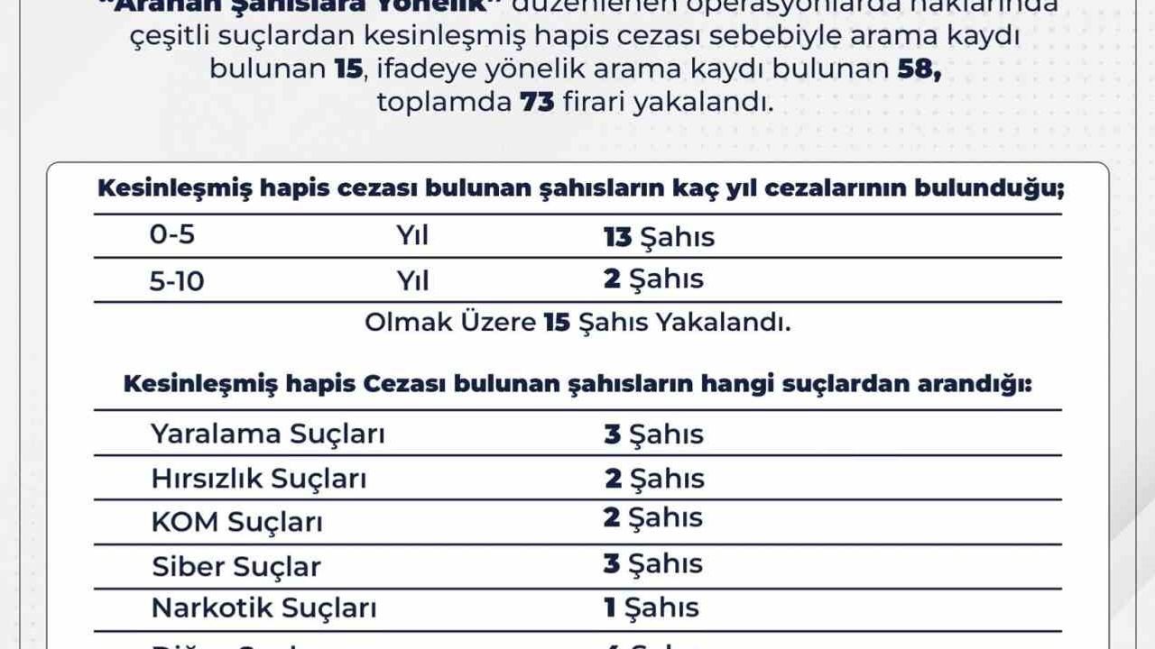 Bingöl Emniyet Müdürlüğü ve Jandarma Komutanlığı, kentte çalışmalarını aralıksız sürdürüyor. Bu çerçevede, 8-25 Eylül 2025 tarihleri arasında gerçekleştirilen çalışmalarda toplam 150 bin 69 şahıs sorgulandı. Ayrıca 31 bin 739 araç denetlenirken 3 bin 28 araca cezai işlem uygulandı ve 181 araç trafikten men edildi. Aynı zamanda haklarında kesinleşmiş hapis cezası bulunan 15 ile ifadeye yönelik arama kaydı bulunan 58 şahıs olmak üzere 72 firarinin yakalandığı bildirildi.