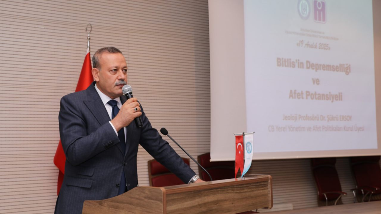 Yıldız Teknik Üniversitesi İnşaat Fakültesi Öğretim Üyesi Prof. Dr. Şükrü Ersoy tarafından verilen konferansta, Bitlis özelinde deprem riskleri ve şehir planlamasının önemi detaylı şekilde ele alındı. Prof. Dr. Ersoy, Bitlis’in Kuzeydoğu Anadolu ve Çaldıran fay hatları gibi aktif fay hatlarına yakın bir konumda olduğunu belirterek, bu durumun bölgenin deprem riski açısından yüksek olduğunu vurguladı.