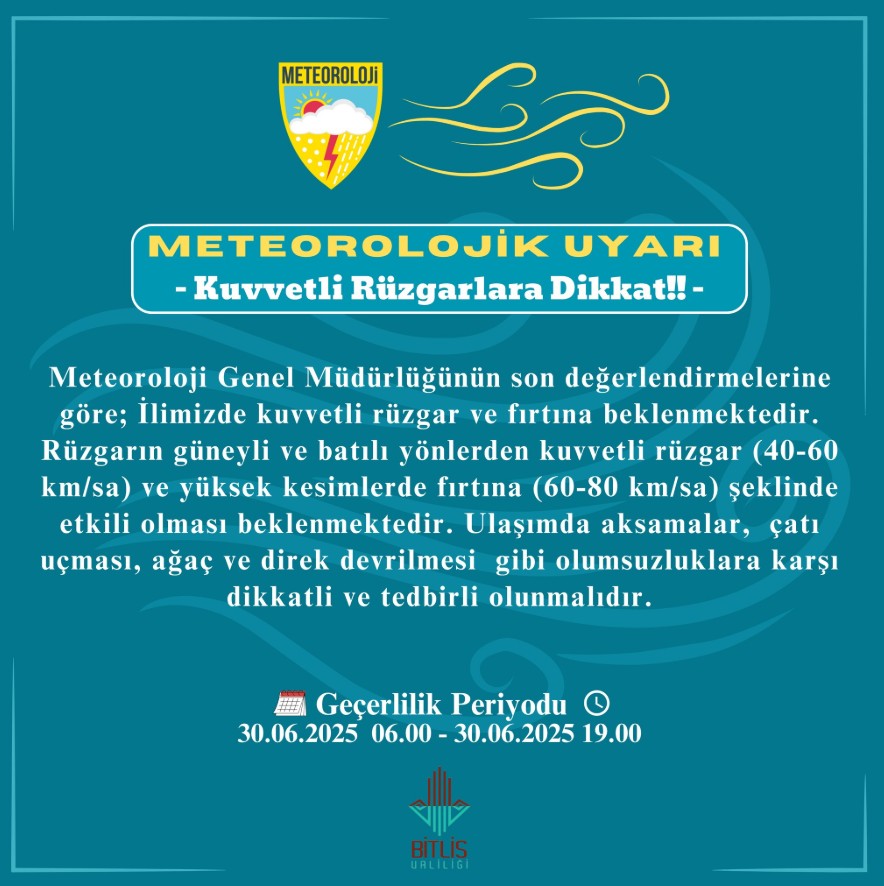 Meteoroloji Genel Müdürlüğünün son değerlendirmelerine göre; İlimizde kuvvetli rüzgar ve fırtına beklenmektedir. Rüzgarın güneyli ve batılı yönlerden kuvvetli rüzgar (40-60 km/sa) ve yüksek kesimlerde fırtına (60-80 km/sa) şeklinde etkili olması beklenmektedir.