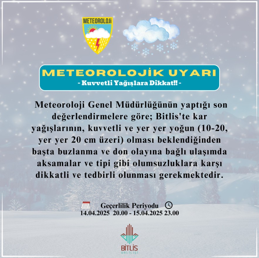 “Meteoroloji Genel Müdürlüğünün yaptığı son değerlendirmelere göre; Bitlis'te kar yağışlarının, kuvvetli ve yer yer yoğun (10-20 cm, bazı bölgelerde 20 cm üzeri) olması bekleniyor. Başta buzlanma ve don olayına bağlı ulaşımda aksamalar ve tipi gibi olumsuzluklara karşı vatandaşlarımızın dikkatli ve tedbirli olmaları önem arz etmektedir.”