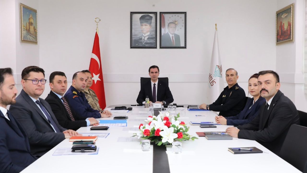 Bitlis Valisi Ahmet Karakaya başkanlığında Valilik Toplantı Salonu’nda gerçekleştirilen toplantıya; İl Jandarma Komutan V. Kd. Albay Ahmet Demirel, İl Emniyet Müdür V. İsmail Ayhan, İl Göç İdaresi Müdürü Cihan Cavli, Ahlat Sahil Güvenlik Karakol Komutanı Üsteğmen Yiğitcan Örikli ve ilgili kurum amirleri katıldı.