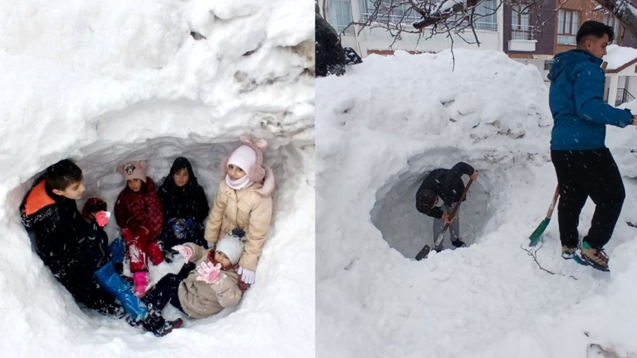 Yoğun kar yağışının ardından okulların ve sokakların beyaza büründüğü kentte, çocuklar ebeveynlerinin de yardımıyla kardan iglo ev yaptı. Soğuk havaya rağmen dışarıda vakit geçiren çocuklar, yaptıkları iglo evin içerisinde oyunlar oynayarak doyasıya eğlendi.